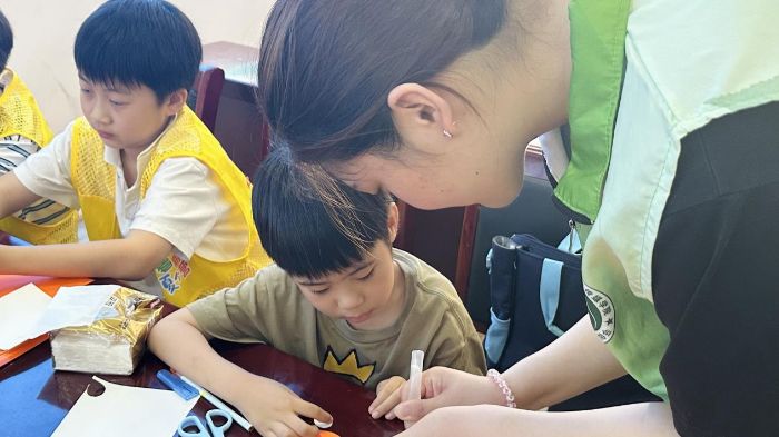 在樹葉貼畫課上,我從生活中常見的一些景色入手,給孩子們展示了許多我們?nèi)粘I钪械臉淙~美學(xué),再由淺入深引導(dǎo)孩子們思考樹葉在日常生活中給我們帶來的作用,之后我和團(tuán)隊其他同學(xué)一起給孩子們分發(fā)樹葉和材料,鼓勵他們發(fā)揮自己的想象力。普通的落葉在孩子們手中煥發(fā)了新的生命。有的用橢圓形的葉子做小魚的身體,有的用細(xì)長的葉子做樹木的枝條,還有的把不同顏色的葉子組合成可愛的小動物。看著那些被秋風(fēng)拂落的自然饋贈,因孩子們的創(chuàng)意而重獲生機,我忽然明白:美從不在遠(yuǎn)方,而在對身邊事物的珍視與想象中。社區(qū)負(fù)責(zé)老師說“用雙手變廢為寶”,這句話讓我深受觸動——教育的意義,或許就是教會孩子在平凡中發(fā)現(xiàn)不凡,用創(chuàng)造力為生活添彩。