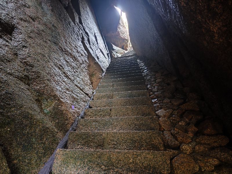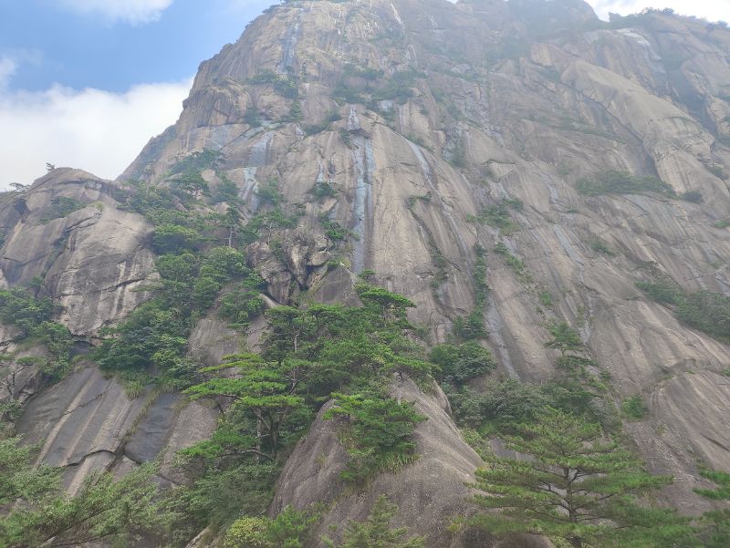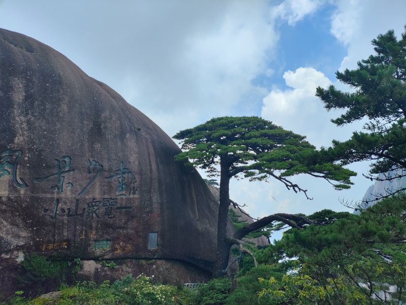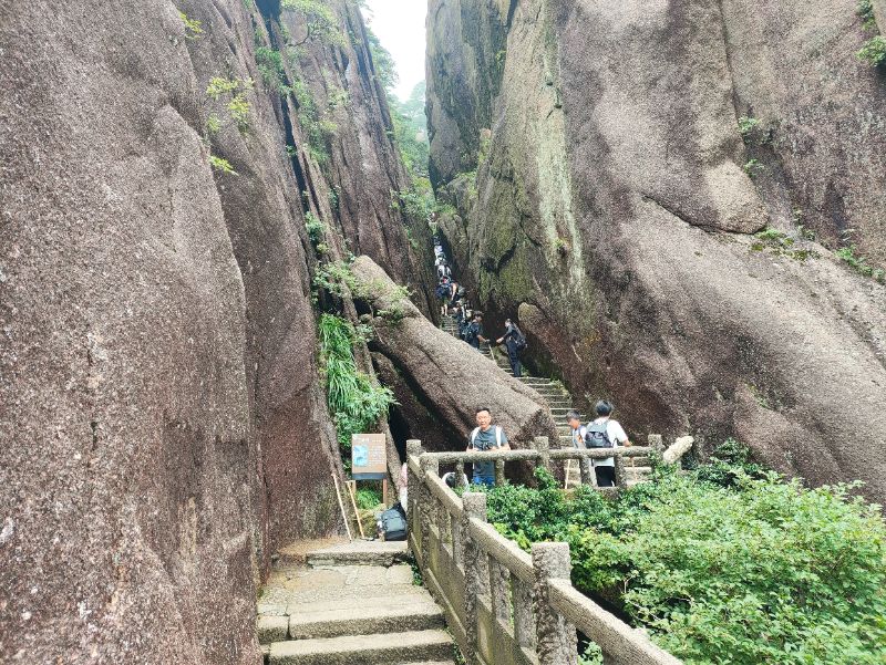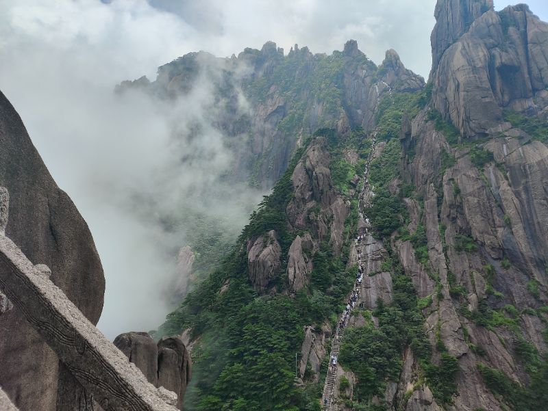 早上8點,徒步上山的旅客并不多,雖然前往迎客松的路程只有幾公里,然而途中的階梯陡峭而又漫長,到中午12點左右才看到迎客松迎風招搖的姿態。越往上爬,人就越多,前往光明頂的路上是密密麻麻的人群,步道變得擁擠。黃山現有保存完好的歷代登山步道總計70余公里,最高處海拔達1864米,其中尤以玉屏樓至天都峰、西海大峽谷懸空棧道等路段最為險峻奇絕。山間散落著歷代摩崖石刻200余處,題刻年代跨越唐宋至明清;點綴峰巒的亭臺樓閣50余座,如散花塢的“散花精舍”、始信峰頂的“臥云亭”,無不依絕壁而生,伴云海而立。這些由條石、古木構筑的杰作,在險惡環境中靜立數百年,無聲訴說著“徽匠”巧奪天工的智慧與不畏艱險的精神。近年來新開辟的西海大峽谷觀光棧道,更以現代工程技藝延續著這份與險峰共舞的壯闊詩篇。