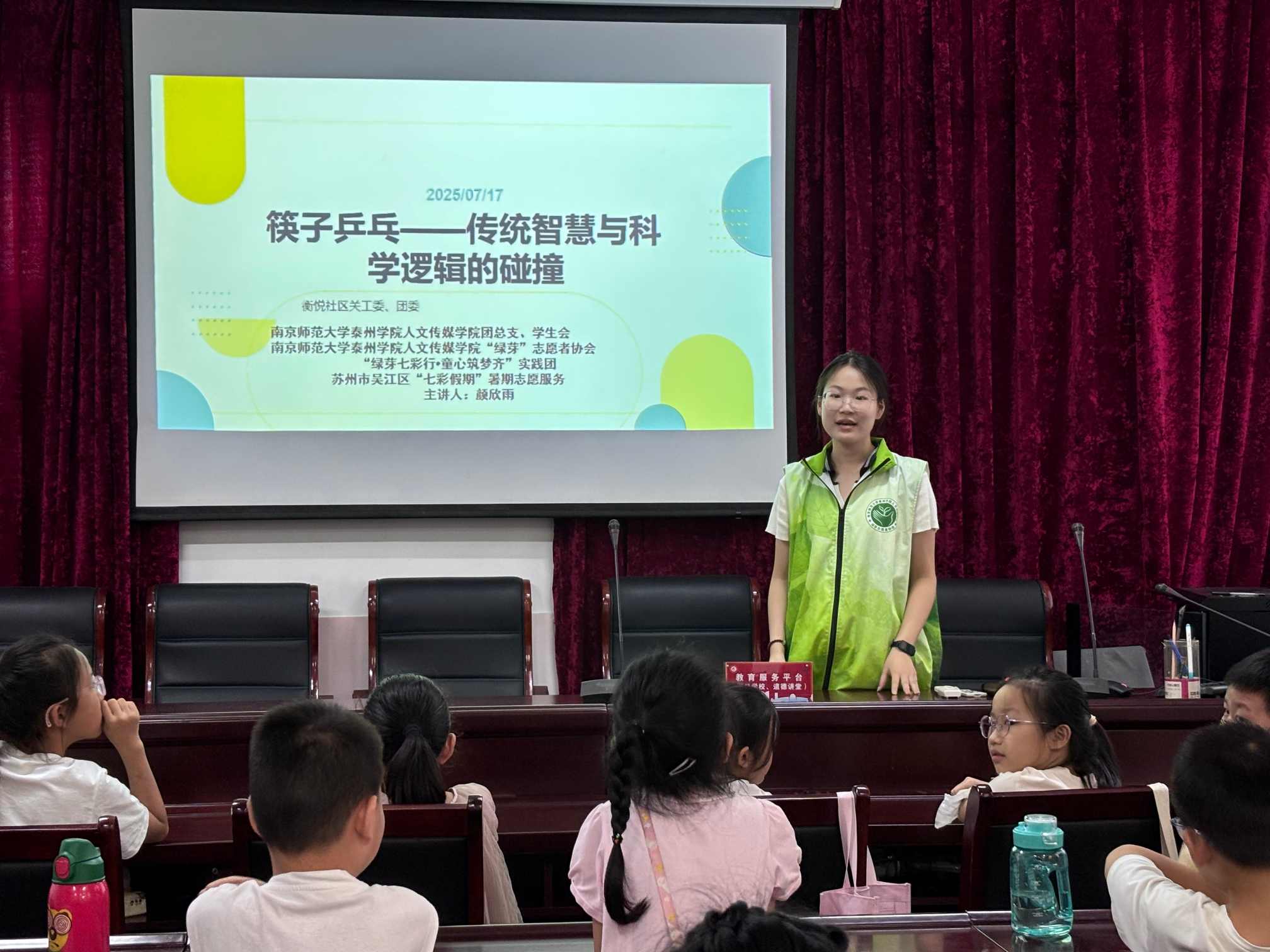 七月的風帶著夏末的溫熱,吹來了我在蘇州市吳江區(qū)衡悅社區(qū)的志愿記憶。作為南京師范大學泰州學院“綠芽七彩行·童心筑夢齊”實踐團隊的一員,我在為期七天的活動中負責了筷子乒乓實踐課、蘇州生態(tài)智慧理論課、《長歌行》勸學詩賞析課的教學,同時承擔著每日課程記錄和一部分圖片記錄與課后音視頻的整理工作。這段經(jīng)歷像一顆飽滿的果實,剝開外殼,里面是課堂上的歡笑聲、孩子們求知的眼神,以及我在“教與學”“記與思”中悄然生長的力量。