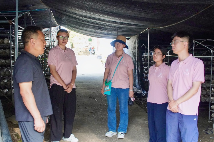 隨后,實踐隊員參觀了店坊河村的食用菌種植基地。基地由政府統一建設,大棚整齊排列,村民可通過繳納租金方式進行承包。據魏書記介紹,食用菌生長期間需嚴格控溫,每年2月種植,9月采收,產品銷往國內外市場。盡管近年來行情有所下滑,但依托較多的大棚資源和較低的人工成本,村民年均仍可實現數萬元收益。同時,該產業吸納了大量勞動力,采摘環節老少皆宜,極大地拓寬了村民的就業渠道。