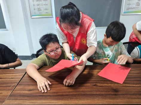 剪紙互動:在對話中剪出創(chuàng)意天地 活動伊始,剪紙環(huán)節(jié)便充滿童趣。隊(duì)員們手持紅紙,從簡單的“五角星”“小花朵”教起,7歲的小宇卻突發(fā)奇想:“老師,能剪個(gè)會飛的房子嗎?就像動畫片里那樣!”面對孩子的奇思妙想,隊(duì)員李瑤沒有直接否定,而是蹲下身與他探討:“那會飛的房子要長翅膀嗎?窗戶想設(shè)計(jì)成愛心形狀,好不好呀?”一來一往的對話中,小宇的創(chuàng)意化作紙上靈動的圖案,引得周圍孩子紛紛效仿,“我要剪會游泳的大象”“我做帶翅膀的書包”,孩子們的奇思妙想讓剪紙作品童趣滿溢。