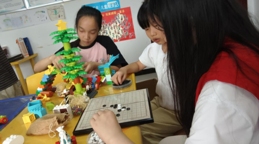 圖為志愿者耐心陪伴小朋友下棋。周明杰攝
