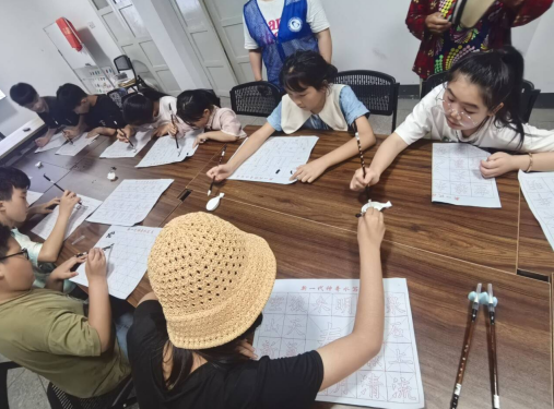 墨香課堂:橫豎撇捺間的情感書寫 "我的毛筆像在跳舞!"8歲的小嘉握著筆桿笑著。書法課上,隊員王晨用"走路"比喻運筆,讓原本緊張的孩子們放松下來。當寫到"家"字時,教室突然熱鬧起來:"我要給'家'畫個小花園!""我的'家'要有彩虹門!"面對天馬行空的創意,隊員們順勢講解漢字結構與家庭文化的關聯。
