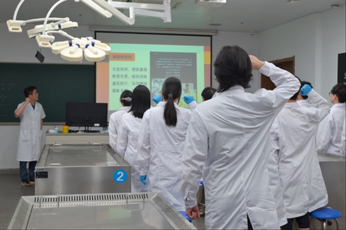 大一的同學是第一次這樣近距離操刀人體局部標本,對于他們而言,這是一次學習專業解剖知識的重大挑戰,也是一次絕佳的提前學習局部解剖學的機會。大二的同學已經學習了完整的解剖學課程,能夠比較熟練地具體指導大一的同學如何根據標本的實際情況來分離脂肪、剔除筋膜,對于他們而言,這是一次指導他人具體實踐的重大挑戰,也是一次難得的實際運用解剖學知識的機會。面對眼前的局部標本,小組成員齊心協力,快速翻閱書本,用心劃動解剖刀,日漸熟練,重要的血管神經在他們的分離下逐漸顯露,主要肌肉的表層筋膜也在解剖刀的揮動下漸漸褪去,小組成員高質量地完成了每日標本制作任務,認真對待每天的實踐日志。為了更好地滿足制作大型人體標本的需要,團隊成員靈活變通,采取2—3組共同完成一項標本制作的策略,互相學習、互相幫助,使標本制作效率得到極大提高,同時,團隊成員每日進行經驗交流與成果分享,實現了團隊協作能力與實操技能的雙提升,為高質量完成標本制作任務提供了絕佳方案。