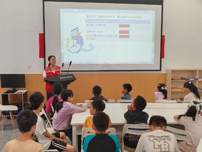 視察首站聚焦團(tuán)隊(duì)精心設(shè)計(jì)的特色課程。在法學(xué)啟蒙課堂,領(lǐng)導(dǎo)們駐足聆聽。隊(duì)員們巧妙運(yùn)用案例分析與角色扮演,將抽象的法條化為孩子們身邊的故事。一場(chǎng)圍繞“校園權(quán)益”的模擬小辯論正在展開,孩子們化身“小法官”、“小律師”,稚嫩而認(rèn)真的發(fā)言中,閃爍著規(guī)則意識(shí)與權(quán)利觀念的最初萌芽。“普法教育從娃娃抓起,你們?cè)诤⒆觽冃奶锊ハ铝朔ㄖ蔚姆N子,意義深遠(yuǎn)。”一位領(lǐng)導(dǎo)在課后交流中深表贊許。