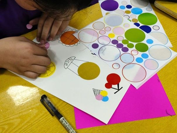 今天,在一堂充滿童趣的支教課堂上,葉子嘉老師帶領孩子們展開了一場與“波點”的創意邂逅。課堂上,彩色圓形貼貼紙與勾線筆成為了孩子們手中的“魔法工具”,他們在卡紙上盡情揮灑想象,用大小不一、色彩各異的波點組合出屬于自己的獨特圖案。(圖一)