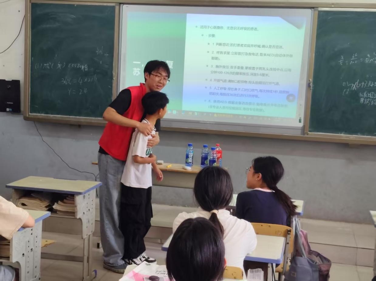 活動以“安全啟蒙+快樂互動”為核心,兩大板塊有序開展。急救知識講解區中,醫學專業隊員借助人體模型和動畫課件,生動講解了流鼻血處理、輕微燙傷急救、海姆立克法等實用技能。隊員們現場演示心肺復蘇操作,并邀請孩子們在模擬人上體驗按壓動作,六年級的周同學認真練習后說:“原來救人要按這個位置,力度還要適中,太有意義了!