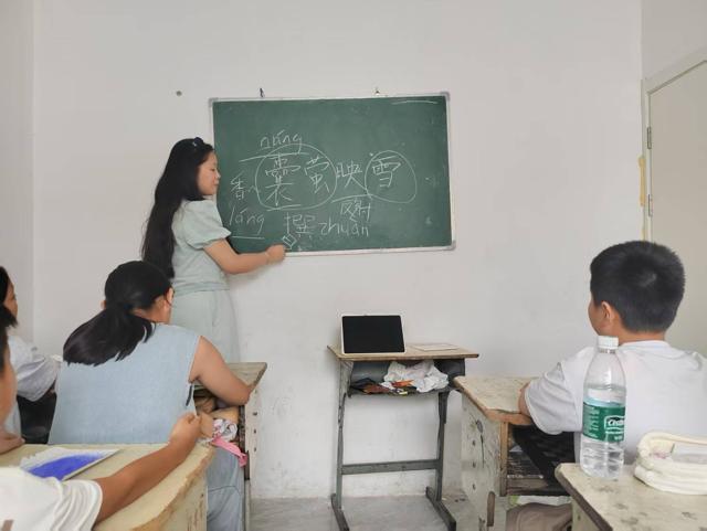 字母連鄉景 “看這個彎彎的‘S’,像不像村口桑樹上的蠶寶寶?”8月3日的課堂上,志愿者周子馨在黑板畫著曲線問道。前排男孩毛豆立刻模仿蠶吃桑葉的樣子,惹得全班大笑。這堂“字母具象化”課是團隊的創新設計,將26個英文字母與鄉村場景對應:“C”是爺爺編的竹筐,“O”是池塘荷葉,“P”是曬谷場的木叉……