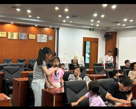 游戲拓展環(huán)節(jié),“擊鼓傳花”和兒歌學(xué)習(xí)讓氣氛持續(xù)升溫。志愿者播放歡快的音樂,彩色花束在孩子們手中傳遞,音樂驟停時(shí)拿到花束的孩子需模仿角色動(dòng)作或說出一個(gè)英文單詞。穿藍(lán)色條紋衫的男孩被選中時(shí),臉漲得通紅,志愿者輕聲鼓勵(lì):“試試說‘brick’,就是你剛才摸過的磚塊哦!”男孩小聲說出單詞后,全場(chǎng)響起掌聲,他嘴角露出了靦腆的笑容。活動(dòng)尾聲,志愿者帶領(lǐng)孩子們學(xué)唱《Three Little Pigs》主題兒歌,配合“蓋房子”“吹房子”的動(dòng)作,將“house”“wolf”等詞匯融入肢體記憶,不少孩子邊唱邊跳,完全沉浸在歡樂中。