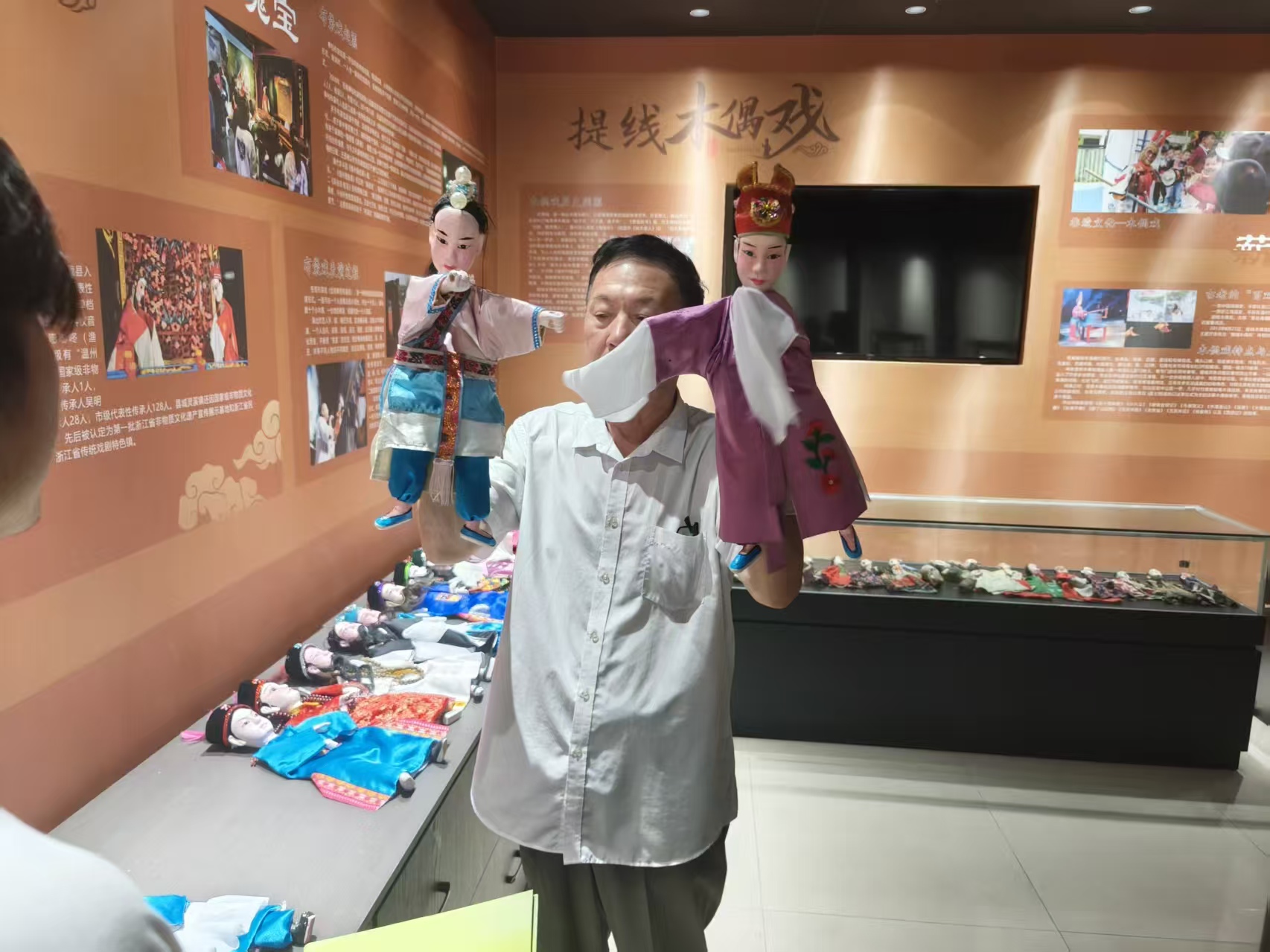 走進(jìn)人民公園,登上幾級(jí)臺(tái)階,迎面看到的就是國家級(jí)非遺傳承人吳明月先生管理的蒼南民間藝術(shù)館。老先生已經(jīng)上了歲數(shù),說話有些不利索,步履蹣跚地帶領(lǐng)我們參觀館內(nèi)收藏的各種人偶。之后的采訪也是如此,老先生說話并不算清楚,需要實(shí)踐團(tuán)成員更加費(fèi)力去聽。但這一印象很快被老先生即興表演的一段《武松打虎》打破了。唱詞念白鏗鏘有力,布袋偶表演氣勢十足。后來吳先生向?qū)嵺`團(tuán)成員介紹,布袋戲表演的精髓在于閩南語唱詞,這讓它通俗易懂,卻也因語言門檻逐漸難以被年輕人接受。好在當(dāng)下仍有許多人致力于傳承非遺文化,布袋戲仍能平穩(wěn)發(fā)展。