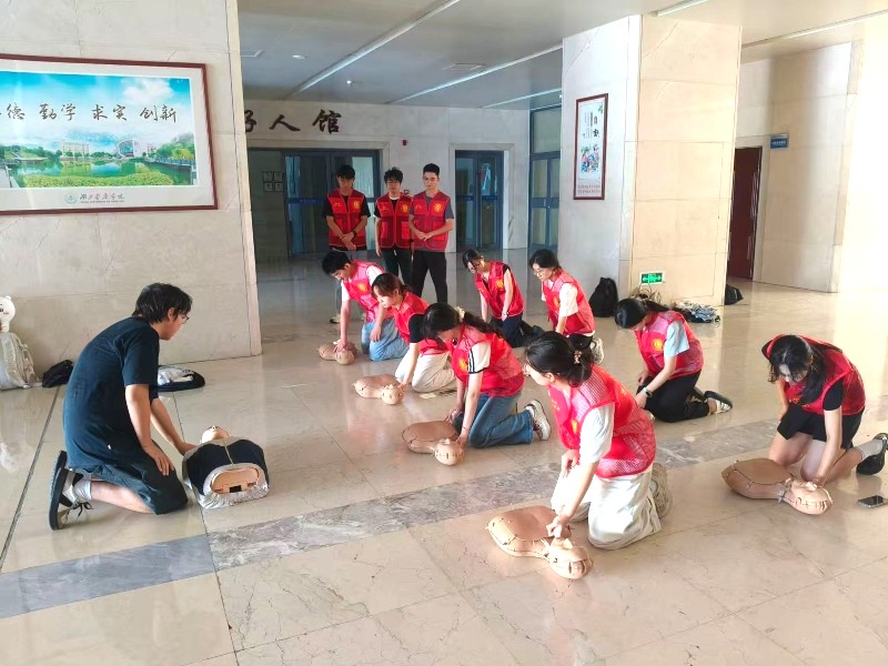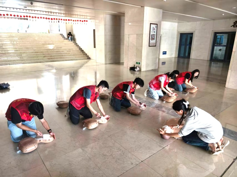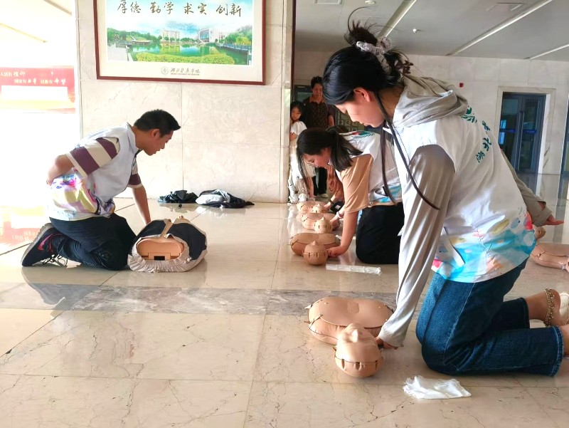 陽光穿透科教樓玻璃穹頂,在半身急救模型上灑下斑駁光影。2025年6月27日,湖北醫藥學院“萬眾醫心”暑期社會實踐隊與“暖陽陽陪診”暑期社會實踐隊(以下簡稱陪診隊)在此開展急救技能聯訓活動,通過理論研習、實操演練、經驗互鑒,共同探索“急救+陪診”服務模式的創新融合。