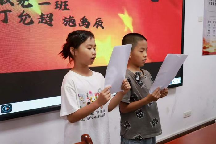 為傳承鄉土文化中的德育智慧,對小朋友們的心理與品德進行雙重滋養,微光小隊在夏令營期間開展了心理健康、紅色黨史等一系列課程,并舉辦了一場紅色匯演活動。《滿江紅》的演繹培養奮斗精神,袁隆平故事的演講播撒農業夢想,齊聲合唱《我和我的祖國》傳遞家國情懷。