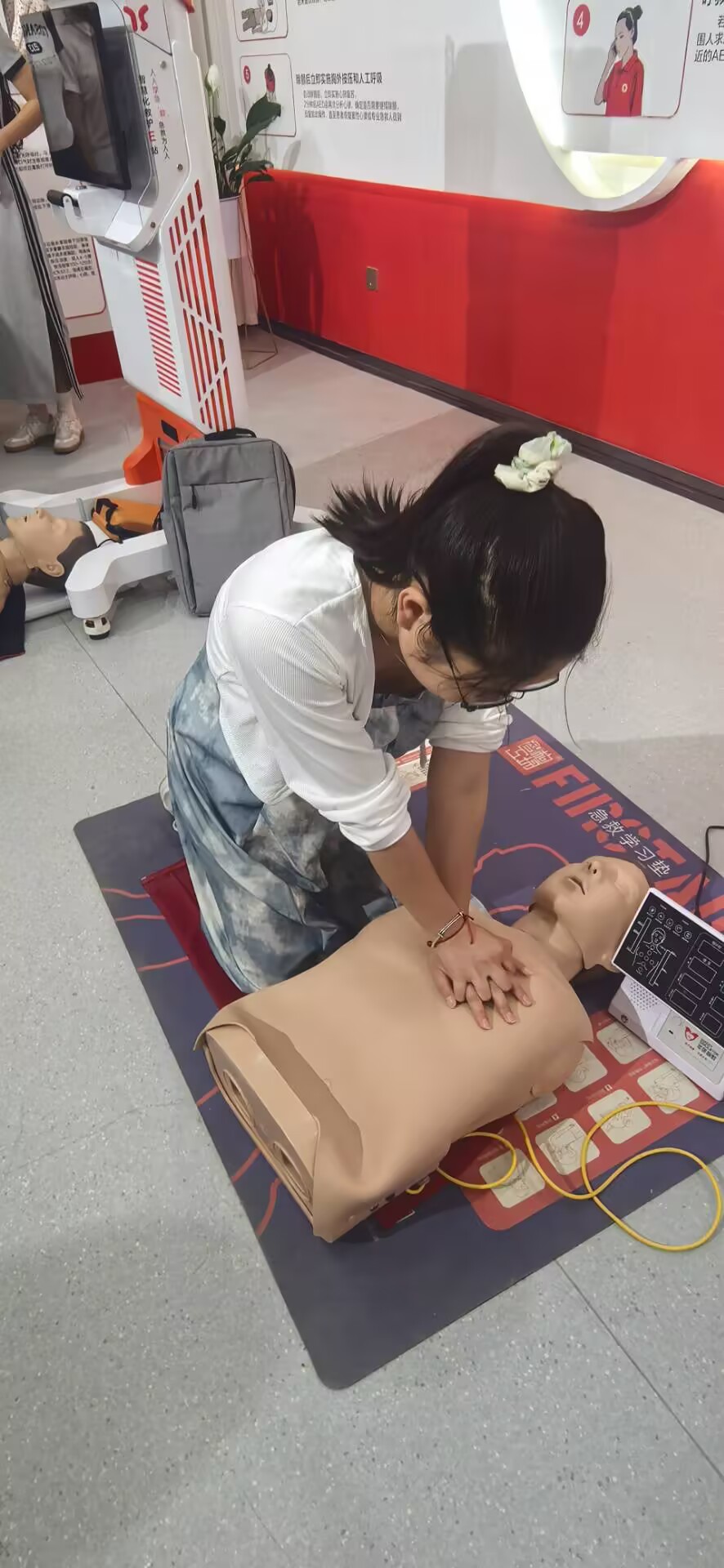 社會實踐現場,志愿者們通過理論講解、實際操作演示、互動問答等多種形式,為群眾詳細介紹急救知識。醫學專業的學生充分發揮專業優勢,用通俗易懂的語言講解心肺復蘇、海姆立克急救法、創傷包扎等常見急救技能的原理和操作要點。“雙手交疊,用掌根按壓兩乳頭連線中點,頻率至少每分鐘100次,深度至少5厘米……”志愿者一邊耐心講解,一邊利用模擬人進行規范操作演示,每一個動作都精準到位,力求讓群眾清晰明了。