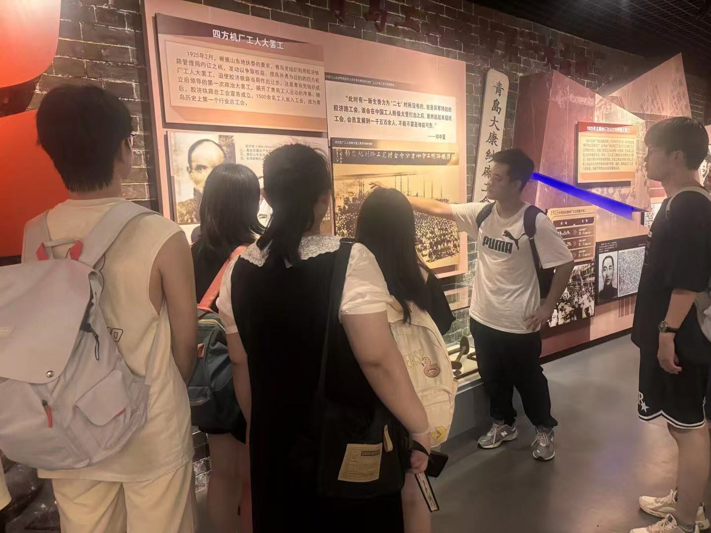 中午11點,在中共青島黨史紀念館,隊員們駐足于德式建筑風格的舊址前,這座1904年建成的四方機廠職員宿舍,曾是青島早期黨組織傳播馬列主義、領導工人運動的重要陣地。展館內陳列的《青島潮》期刊、王盡美鄧恩銘手稿復刻件等珍貴文物,生動再現了早期共產黨人在膠州大地播撒革命火種的英勇事跡。昔日工人運動如火如荼的老廠房,如今已變身紡織主題博物館和紡織遺址公園,館內詳實的史料和實物,及館外的水塔、老井、制冷站、鐵路專線橋等多處工業遺址,完整展現了紡織工業生產體系,再現了中國紡織“上青天”的光輝歲月。隊員們深刻體會到青島黨組織自1923年建立以來,在革命、建設、改革各個歷史時期的奮斗歷程。