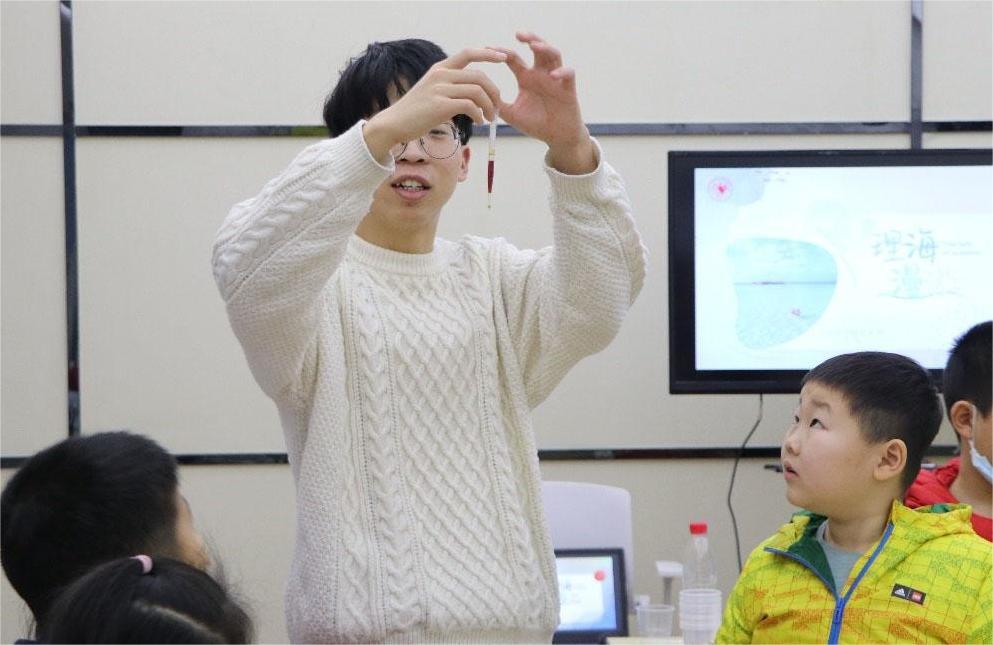 活動伊始,山東大學學生唐仲英愛心社志愿者郭逸凡通過問答互動的形式,向孩子們介紹了化學的含義。他指出,化學是一門研究物質(zhì)組成、結(jié)構(gòu)和變化的科學,而化學的魅力正蘊藏在對于物質(zhì)世界的不斷探索之中。經(jīng)過簡單的理論講解,孩子們進一步熟悉了生活中常見的化學現(xiàn)象,更好地幫助孩子們進行接下來的實驗環(huán)節(jié)。