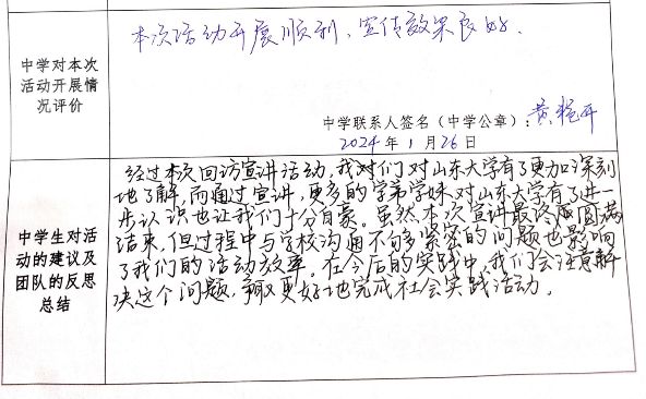 經過這次回訪活動,我感觸頗深。作為山大的一份子,我真的做到讓更多人了解山大;而作為母校的畢業生,我盡力為學弟學妹們,也為曾經的自己解答了高三的部分迷茫與困惑。相信經過不懈的努力,我們會在在不久的將來再次相遇!