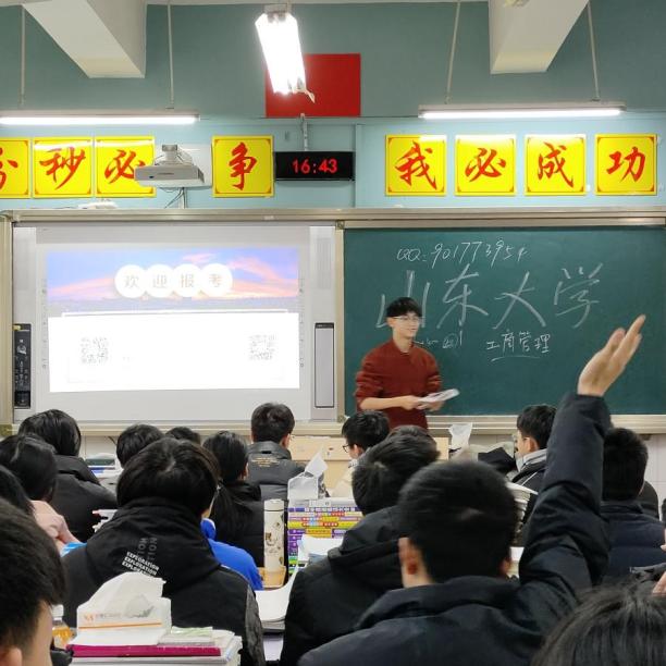 回到熟悉的校園,我懷揣著的卻是不同的心情,面對(duì)陌生的學(xué)子面孔,我站到講臺(tái),在黑板上寫下“山東大學(xué)”的字樣。這是我本次母校回訪的重要目的,宣傳我的大學(xué)——山東大學(xué)。興許是學(xué)子們洋溢的熱情融化了冬日的凜冽,我竟覺得不怎么寒冷了,緊張的心情也漸漸放松。