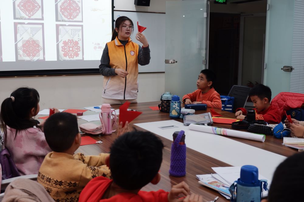 下午三時許,山東大學本科生李英姿為孩子們教授手工剪紙課。孩子們熱情高漲、互幫互助,認真學習折紙、繪畫、裁剪等環節,最終交出了令人滿意的作品。火紅的新年窗花映襯著孩子們純真的笑臉,本節課也獲得了孩子們的喜愛。