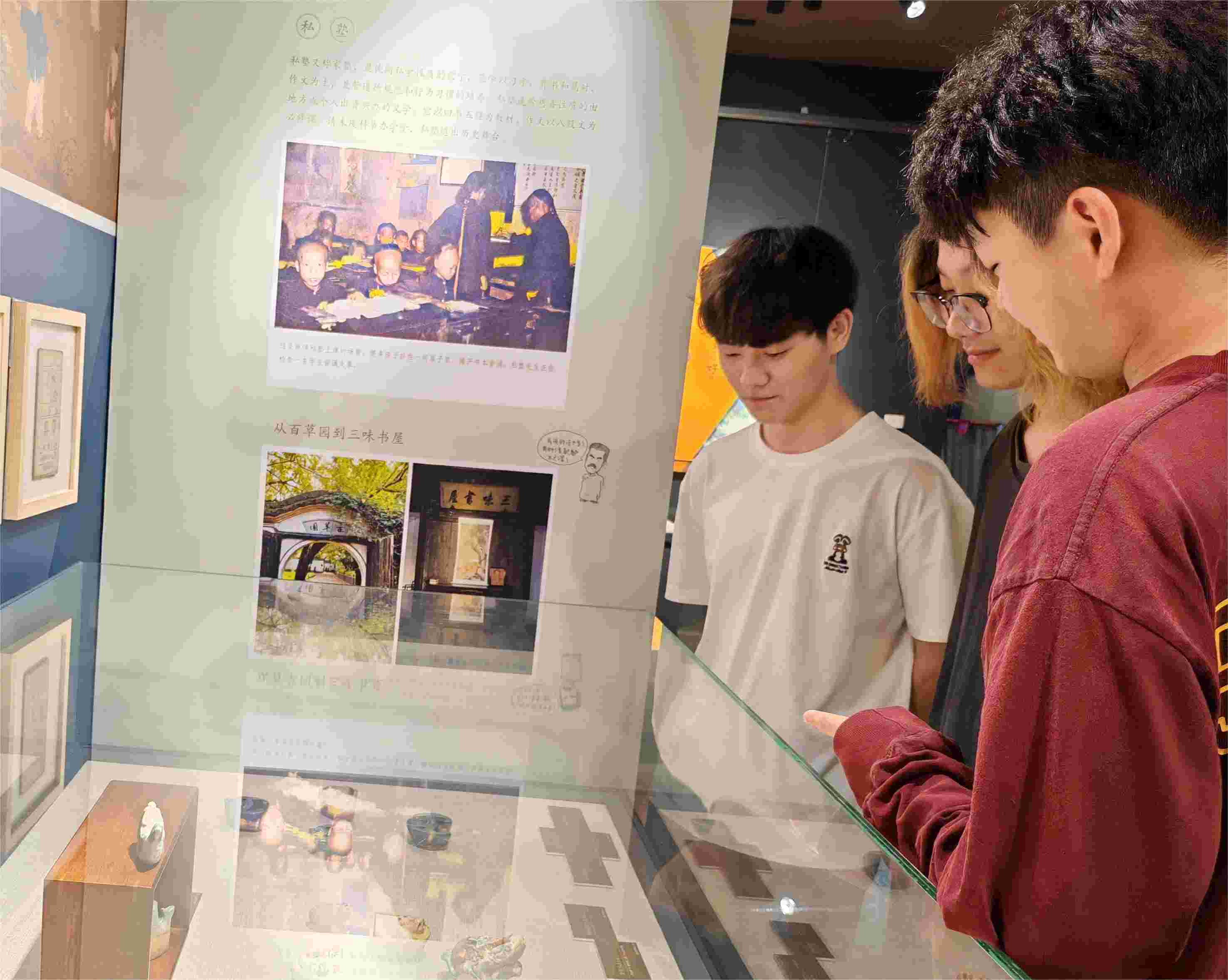 畫面中的他們站在展示柜前,共同欣賞著眼前的藝術品和文物。左邊那位男同學以他特有的熱情和細心,引領著同學們一同探索歷史的奧秘,他的講解生動有趣,讓每一個同學都聽得津津有味。