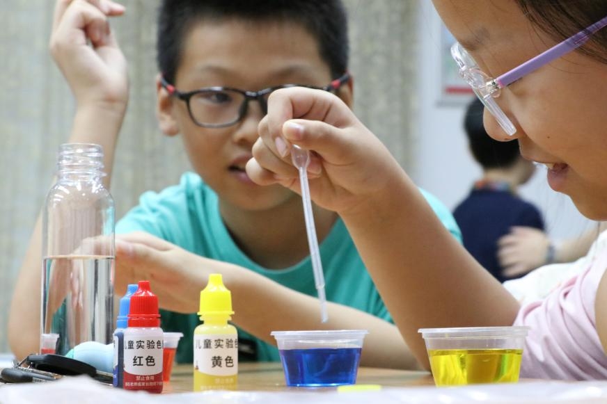 在感受了大運河文化的魅力之后,實踐團隊又帶領(lǐng)小朋友們走進了神奇的科學(xué)世界。第一個科學(xué)實驗是關(guān)于三原色的小實驗。實驗臺上擺放著三種顏色的液體,有藍色、黃色、紅色。講解員先向小朋友們介紹了三原色的概念,然后開始演示實驗。只見他們將不同的液體倒入一個透明的玻璃杯中,神奇的現(xiàn)象發(fā)生了:混合的液體形成了新的顏色。在實踐團隊成員的指導(dǎo)下,小朋友們親自動手進行實驗,感受著科學(xué)的奇妙。