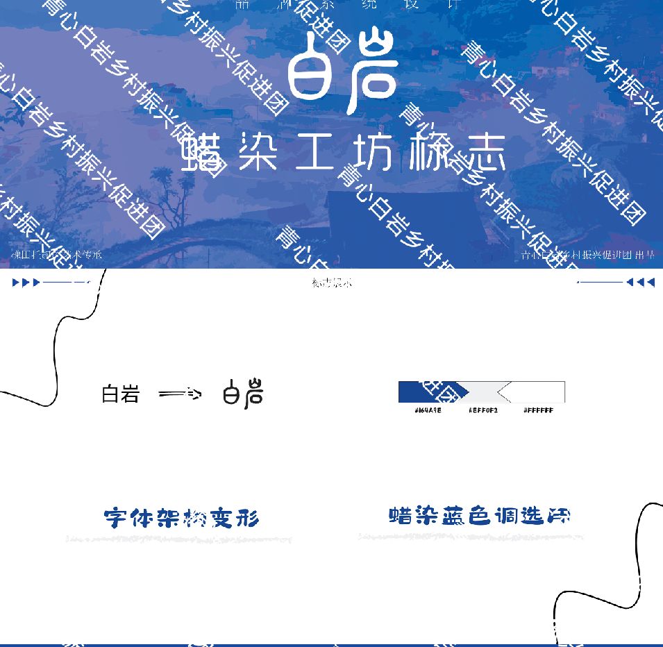 為了進一步助力鄉村旅游業,除了大米包裝袋的設計,團隊還設計了白巖村蠟染工坊標志,并為蠟染工坊制作了宣傳展板,宣傳展牌上,蠟刀與染料桶的生動形象吸引著過往行人的目光,讓人不禁想要親身體驗一番這項古老的技藝。同時,團隊還配套設計了一系列宣傳和實用物品,一次性水杯與毛氈片的設計也融入了蠟染元素,以蠟染的白色為背景,中間鑲嵌著藍色的白巖logo圖,文創周邊的設計落地使用后,可以讓苗族蠟染的元素融入游客的住宿體驗中,提高白巖文化的傳播。