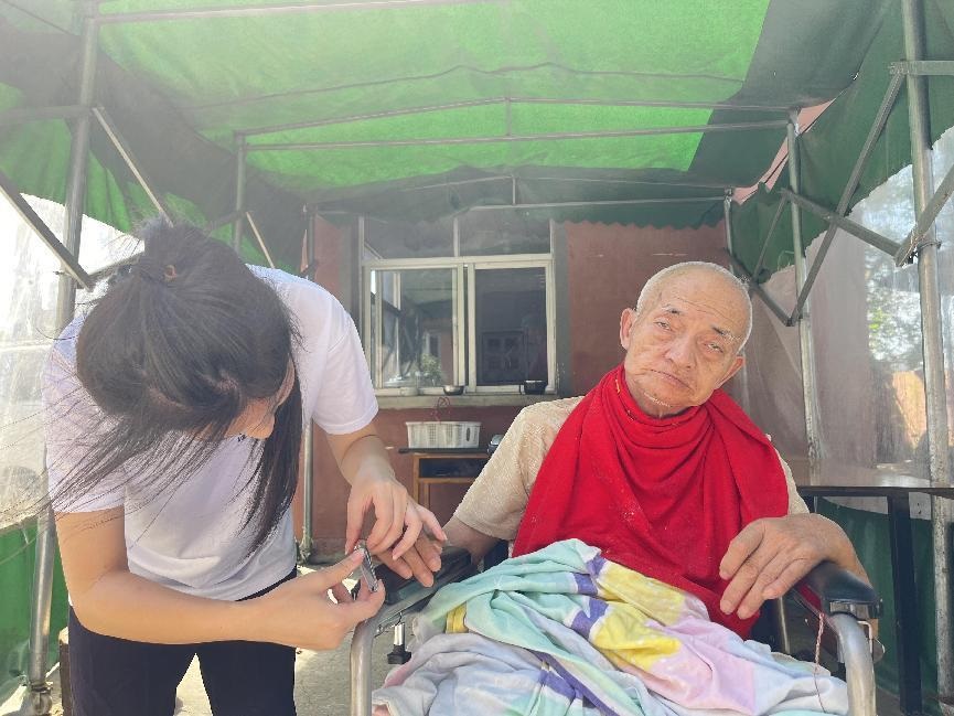 除了文藝演出,一位女同學還細心地為老人提供了貼心的服務。她拿起指甲剪,輕柔地為老人修剪指甲,每一個細微的動作都透露出對老人的尊重與關愛。老人的手,在年輕人的呵護下,似乎也變得年輕了許多。
