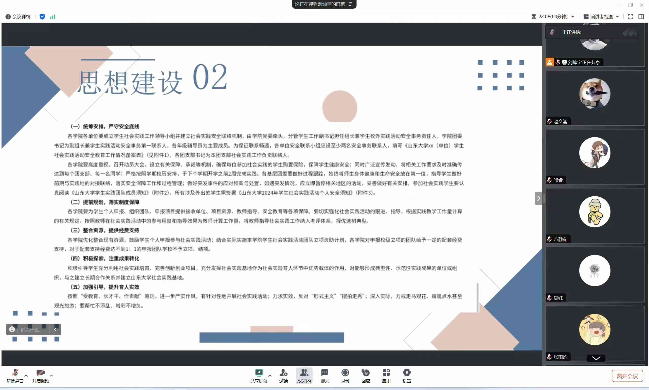 “團隊只有凝聚力和協作能力強,才能更好地完成社會實踐任務。”劉坤宇鼓勵團隊成員們積極交流、互助合作,并提出了一些團隊建設的方法和途徑。團隊成員們紛紛發表意見,分享了彼此的團隊合作經驗和思考,達成共識,并制定了一系列團隊建設計劃,旨在增強團隊意識,提升協作能力。最后,劉坤宇總結并升華了會議內容,鼓勵團隊成員們將會議討論的成果真正落實到實踐中。他表示,團隊的安全和發展需要每個成員的共同努力,希望大家以更高的標準要求自己,為團隊的成功做出貢獻。