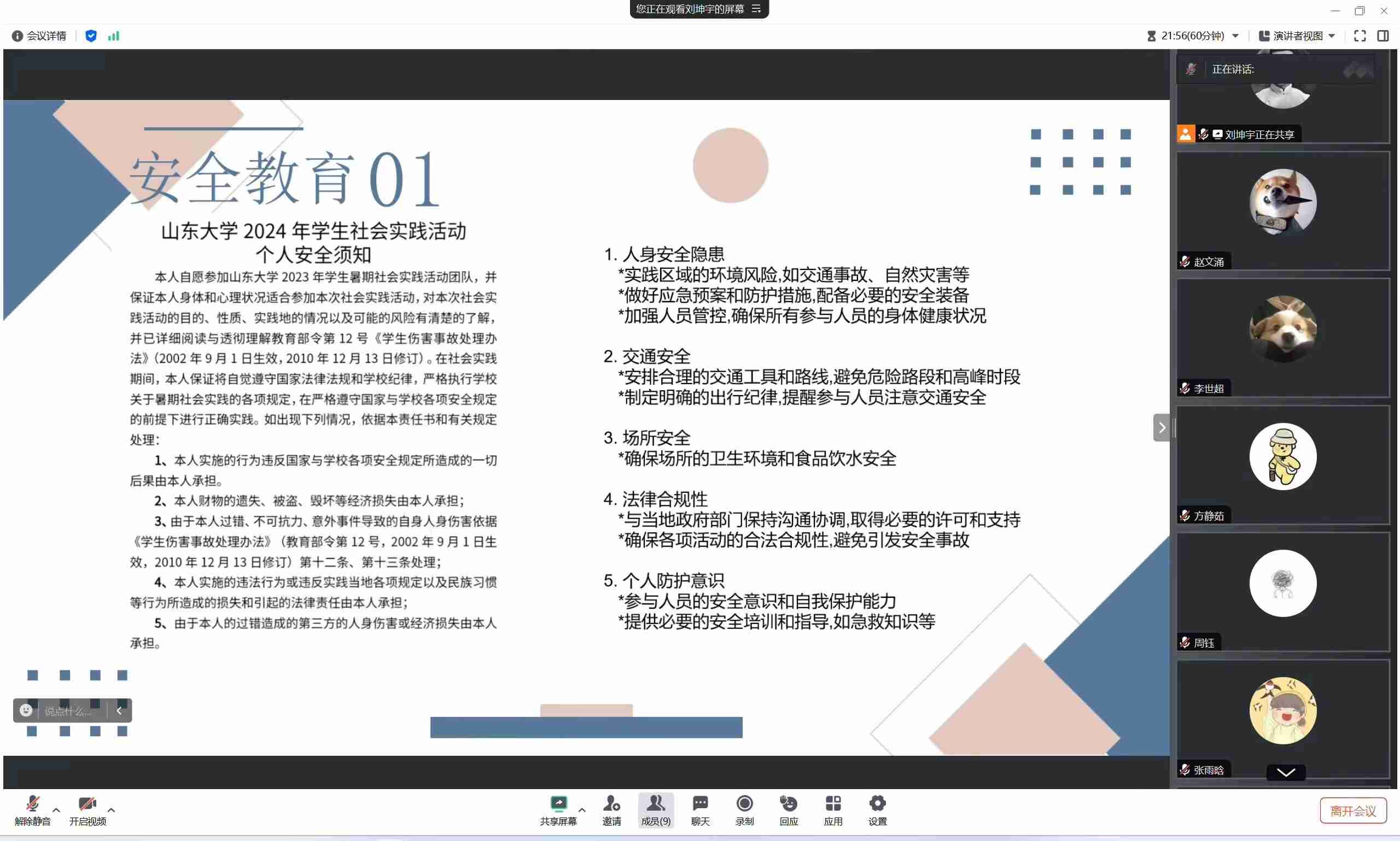 本次活動由團隊負責人劉坤宇主持,社會實踐團隊全體成員參與。劉坤宇首先著重強調了安全意識的重要性與必要性,他指出團隊成員要時刻牢記安全第一,并介紹了一系列安全防范措施和應急預案。團隊成員們積極參與討論,分享了自己的安全經驗和意見,共同制定了安全教育的具體措施,以確保社會實踐活動在安全保障的前提下進行。接著,劉坤宇表達了對團隊的思想建設和協作能力的關注。
