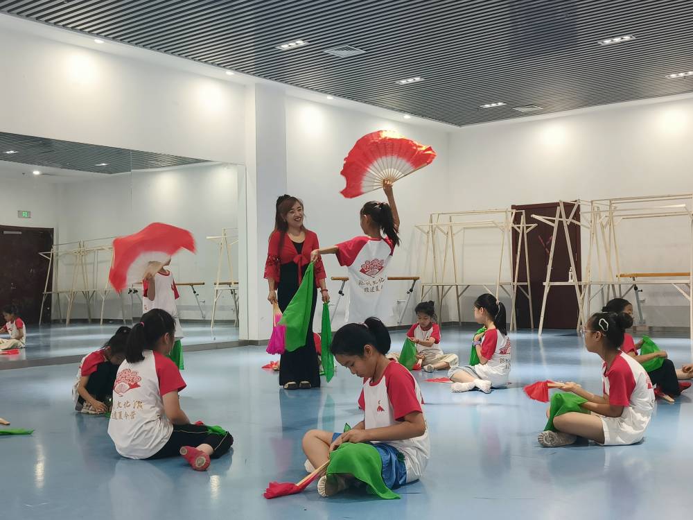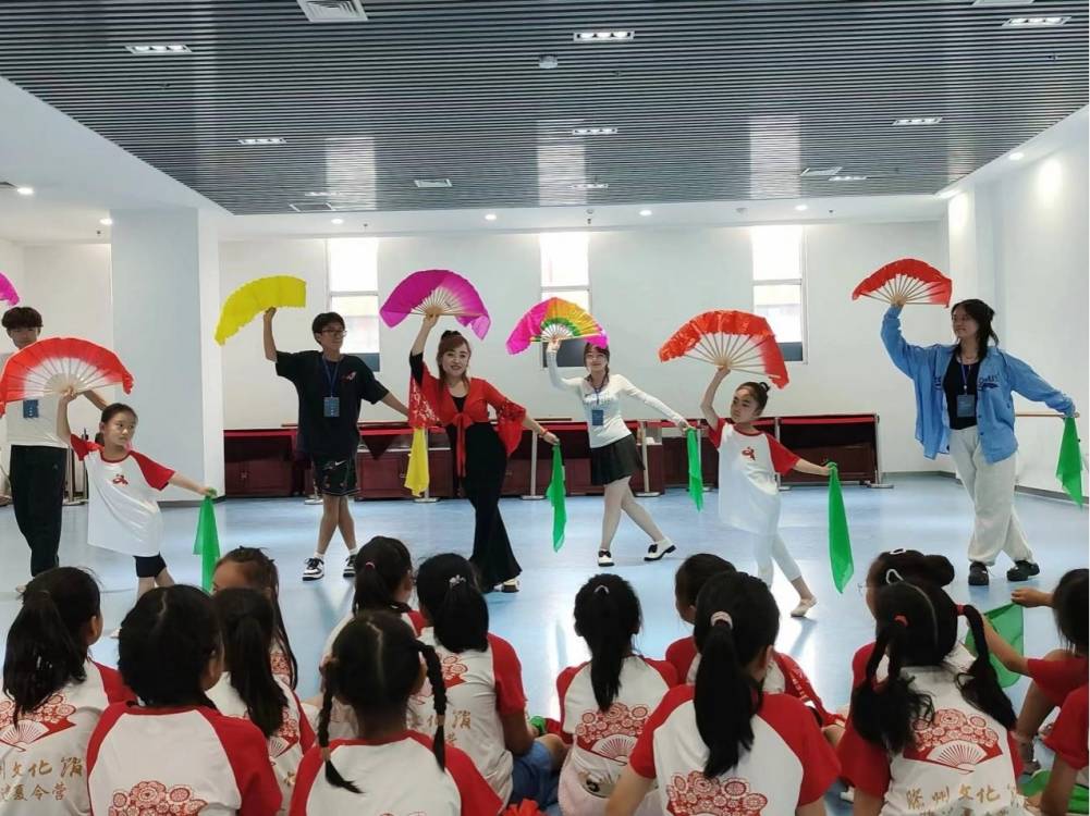 調研過程中,實踐隊隊員有幸在李老師的指導下與孩子們共同學習,了解到了膠州秧歌的基本體態、基本腳位與持扇方法,以三彎九動十八態的風格動律展現舞蹈動態過程中力的延伸之美。李老師指出,膠州秧歌強調“三道彎”的體態特征,同時腳呈丁字位,主要體現在動態流動過程和靜態舞姿中,以動力腳為支點帶動腰及上身各部位的扭動,形成流動中“三道彎”的曲線特征狀態和擰腳、讓胯,略腆腮的“三道彎”形態。通過此次細致的學習,實踐隊成員們感受到了地地道道的秧歌舞蹈,體悟其內在精髓。