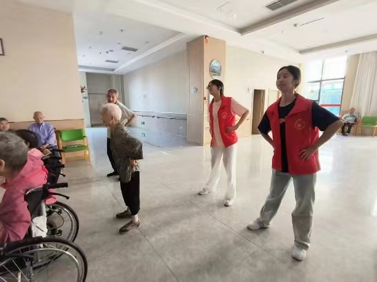 2024 年 7 月 16 日上午 9 時,在重慶市長壽區八顆街道養老服務中心,重慶師范大學初等教育學院“青春飛揚·季憶夏鄉”暑期“三下鄉”志愿服務隊的隊員們在稍作休憩后,引領著爺爺奶奶們來到了一樓的活動大廳,開啟了一場充滿活力與溫馨的早操之旅。