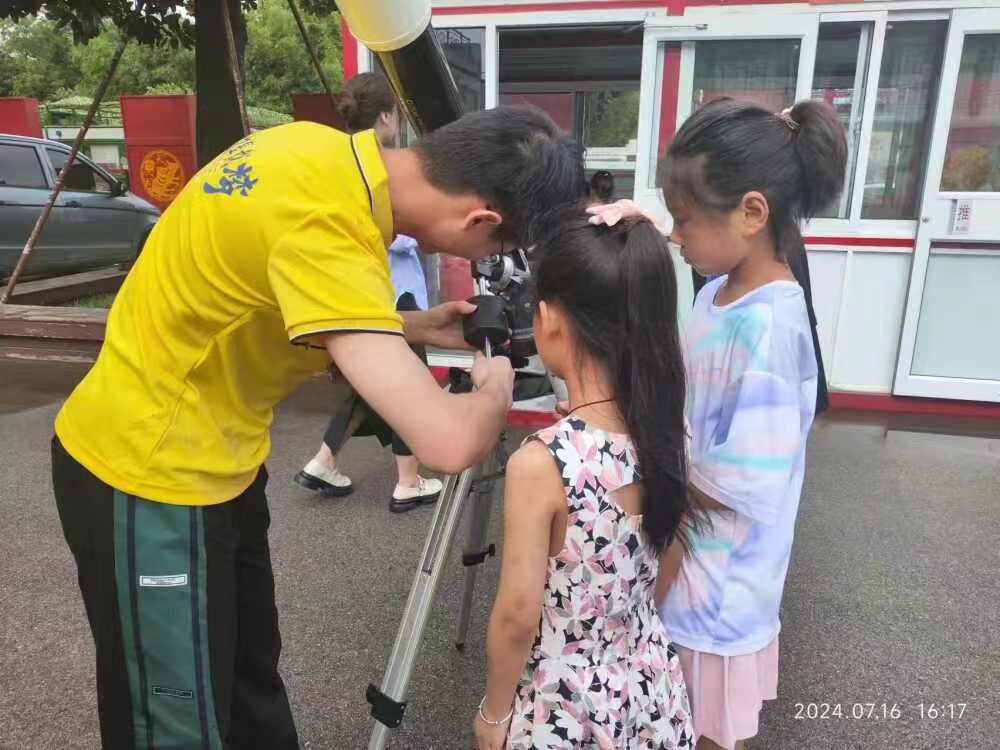 室內活動結束后,隊員們組織孩子們來到室外,講解天文望遠鏡的基本結構、組裝方法、使用方法以及進行天文觀測活動。這不僅使孩子們親身體驗了科學的魅力和神秘感,激發了他們對科學的興趣,而且在組裝天文望遠鏡的過程中培養了他們的團隊協作能力和動手能力,在觀測過程中也提升了他們的仔細觀察和分析能力,有助于孩子們的素質培養。