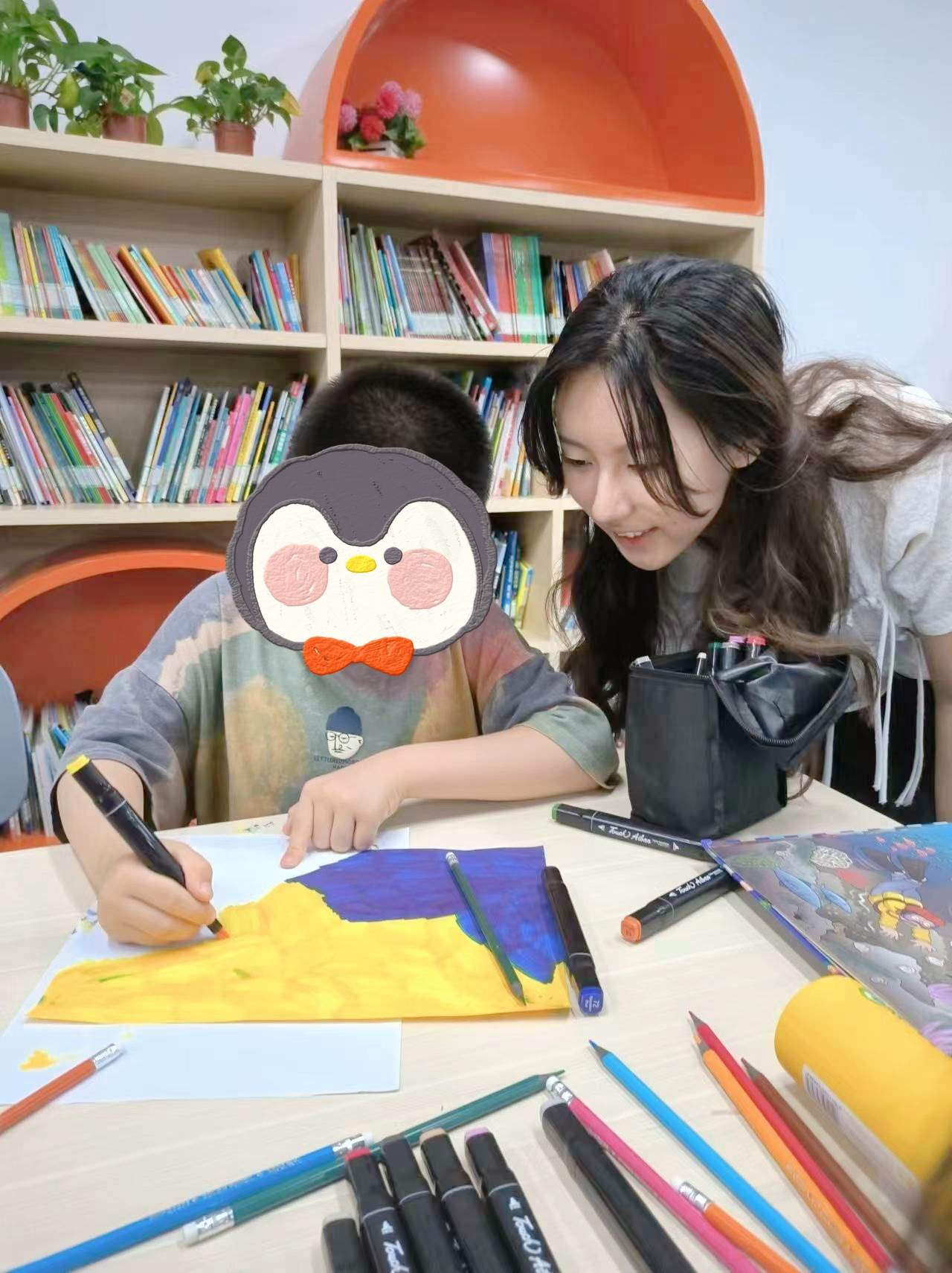 為了更深層次理解情緒的內涵,培養孩子們的動手實踐能力,在成員曾子怡的帶領下,孩子們前往閱覽區進行情緒繪畫活動。在實踐團成員的陪伴與引導下,孩子們緊繃的神情慢慢舒緩下來,畫作的顏色也從深色慢慢地變成了淺色。禾潤滕老師表示,孩子們開始普遍采用深色創作是由于進入陌生環境的不適應,在實踐團成員的陪伴下他們卸下了心防,畫作也開始由淺色為主進行創作,畫作的內容也由抽象的色塊具象化為代表情緒的事物。課堂中無論是孤獨癥孩子們還是其他讀者小朋友,都認真進行了自己的創作,也有幾位參與活動的普通小朋友在畫完自己的畫作后,幫助孤獨癥孩子們進行繪畫,這恰恰也體現了游學活動幫助孤獨癥兒童融入社會的活動宗旨。
