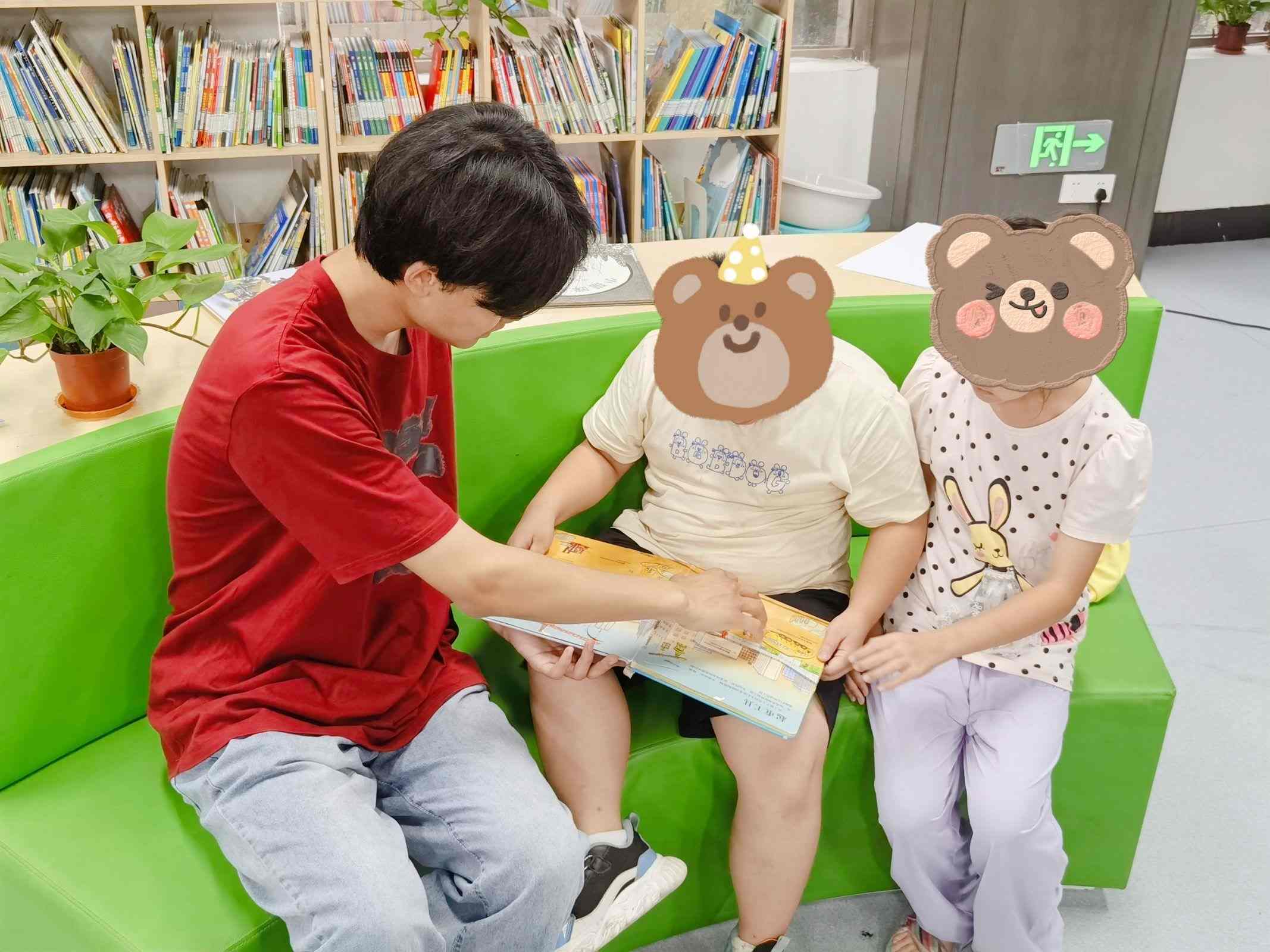 繪畫活動結束后,董堯順、郭耀輔、賈格等成員分批次教授孤獨癥孩子們借還圖書、尋找圖書的方法,幫助孩子們熟悉圖書館閱讀的基本流程。在實踐團成員的幫助下,孩子們選擇了自己喜歡的書籍,隨后前往閱覽區,由實踐團成員“一對一伴讀”。