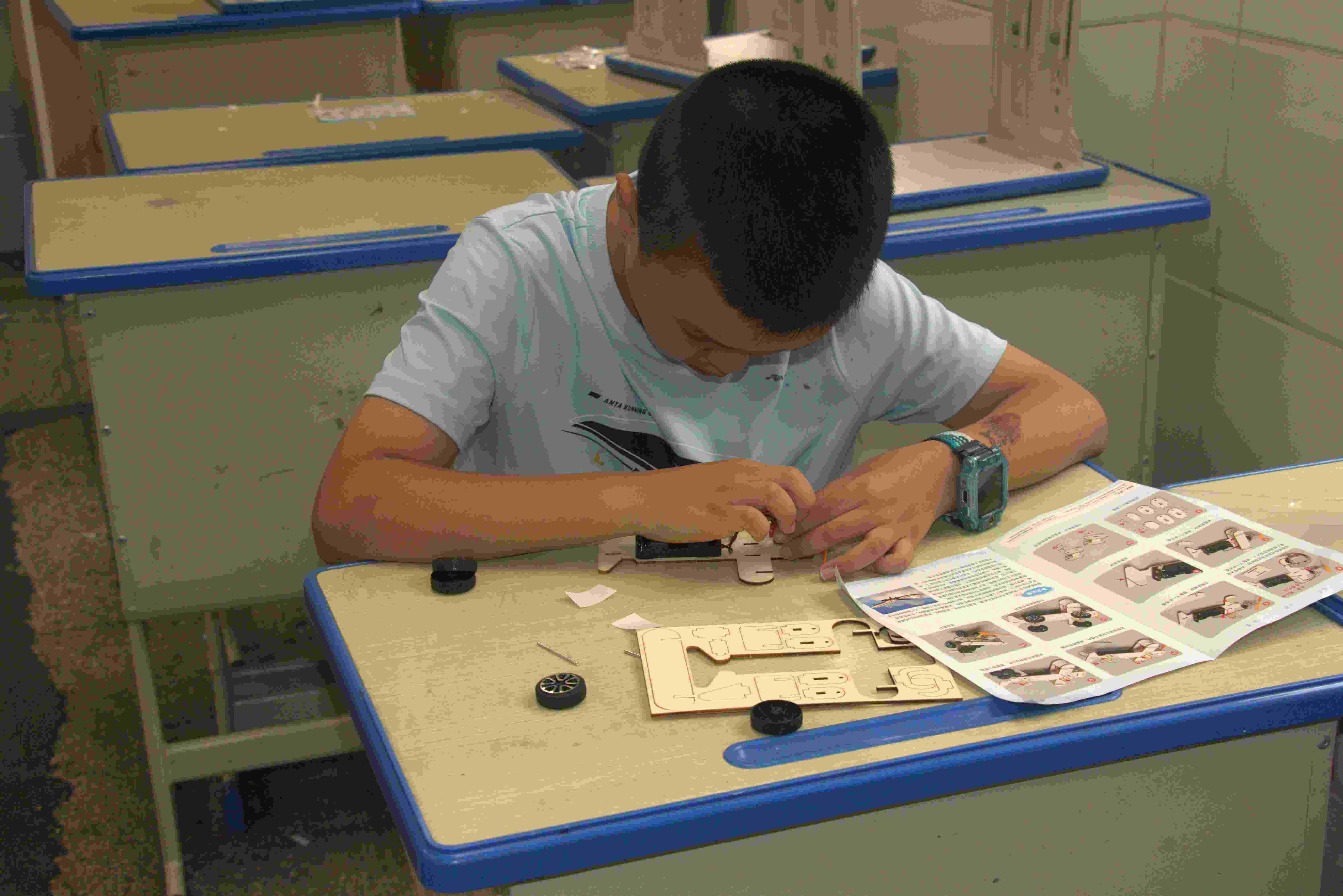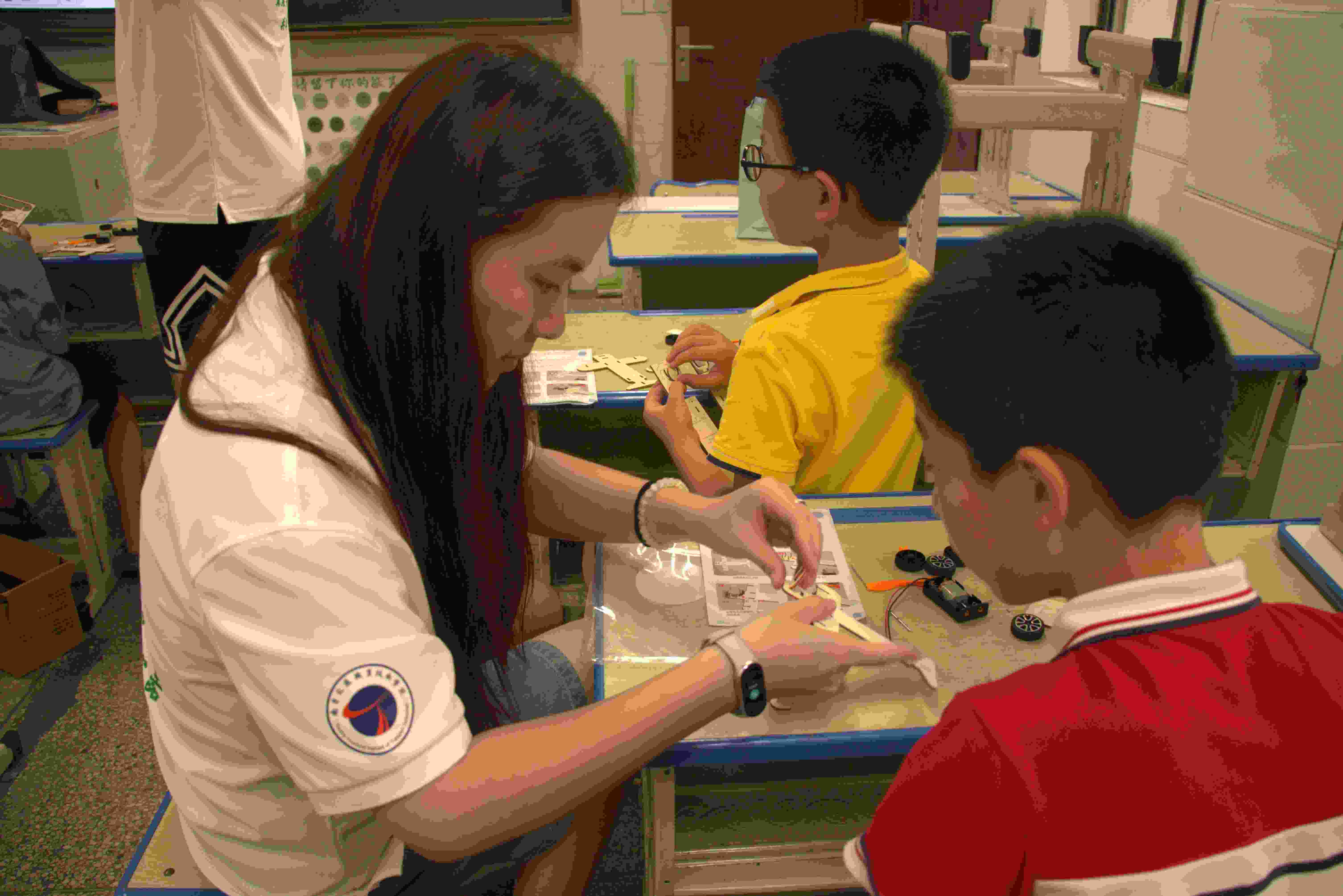 在實踐環節,實踐團成員為每位同學分發了簡易航模拼裝材料包。志愿者們俯身為孩子們示范講解,手把手指導他們識別零件、組裝機身、安裝螺旋槳。原本零散的塑料零件,在一雙雙小手中逐漸變成栩栩如生的無人機模型。