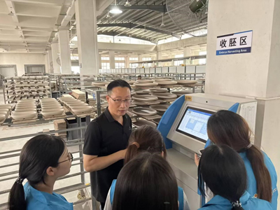 同日下午,團(tuán)隊(duì)來到廣東金強(qiáng)藝陶瓷實(shí)業(yè)有限公司,該公司數(shù)字化轉(zhuǎn)型走在行業(yè)前端,去年獲得中國(guó)陶瓷工業(yè)協(xié)會(huì)授予的“中國(guó)輕工陶瓷行業(yè)數(shù)字化轉(zhuǎn)型先進(jìn)企業(yè)”稱號(hào),對(duì)團(tuán)隊(duì)研究企業(yè)數(shù)字化轉(zhuǎn)型成功案例有重大作用。葛董和譚總非常熱情地帶著團(tuán)隊(duì)參觀公司的生產(chǎn)線。團(tuán)隊(duì)穿梭在企業(yè)錯(cuò)綜復(fù)雜的車間里,腳步匆匆卻目光如炬,才驚嘆于釉料上色的精妙轉(zhuǎn)眼又為智能窯爐的精準(zhǔn)控溫駐足。每一個(gè)生產(chǎn)環(huán)節(jié)都讓隊(duì)員們流連忘返,相機(jī)里存滿了傳統(tǒng)技法與工藝流程結(jié)合的珍貴影像。在這傳統(tǒng)與現(xiàn)代交織的工業(yè)迷宮中,調(diào)研團(tuán)隊(duì)正以敏銳的觀察力和飽滿的熱情,解碼著楓溪陶瓷產(chǎn)業(yè)轉(zhuǎn)型升級(jí)的每一個(gè)關(guān)鍵細(xì)節(jié)。