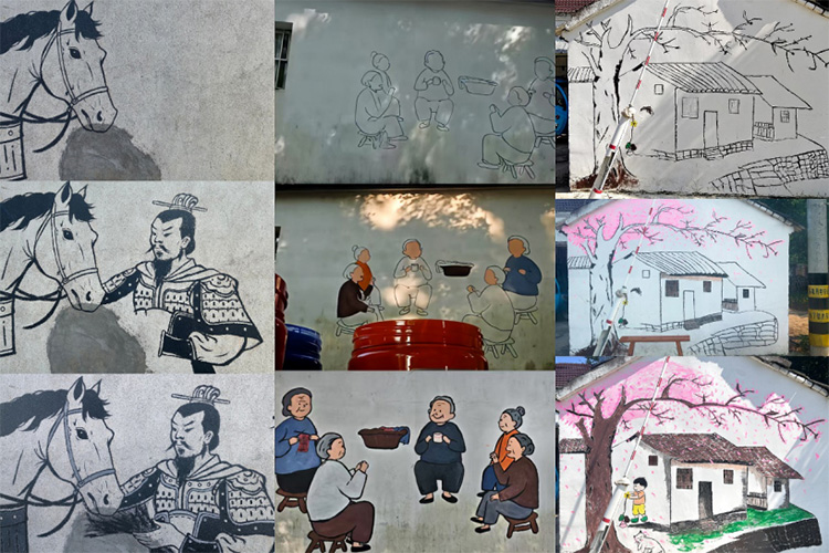 7月4日凌晨四點多,成員們便起床收拾畫具,五點準時出發。此時的村莊還在沉睡,天邊泛起魚肚白,薄霧籠罩田野,別有一番景致。抵達繪制地點后,大家迅速投入工作,有的勾勒輪廓,有的構思細節。隨著太陽升高,氣溫漸熱,汗水浸濕了衣衫,但大家絲毫沒有懈怠,專注地將腦海中的畫面呈現在墻面上。上午八點多,因烈日難耐暫作休息時,看著初具雛形的作品,成員們心中滿是成就感。