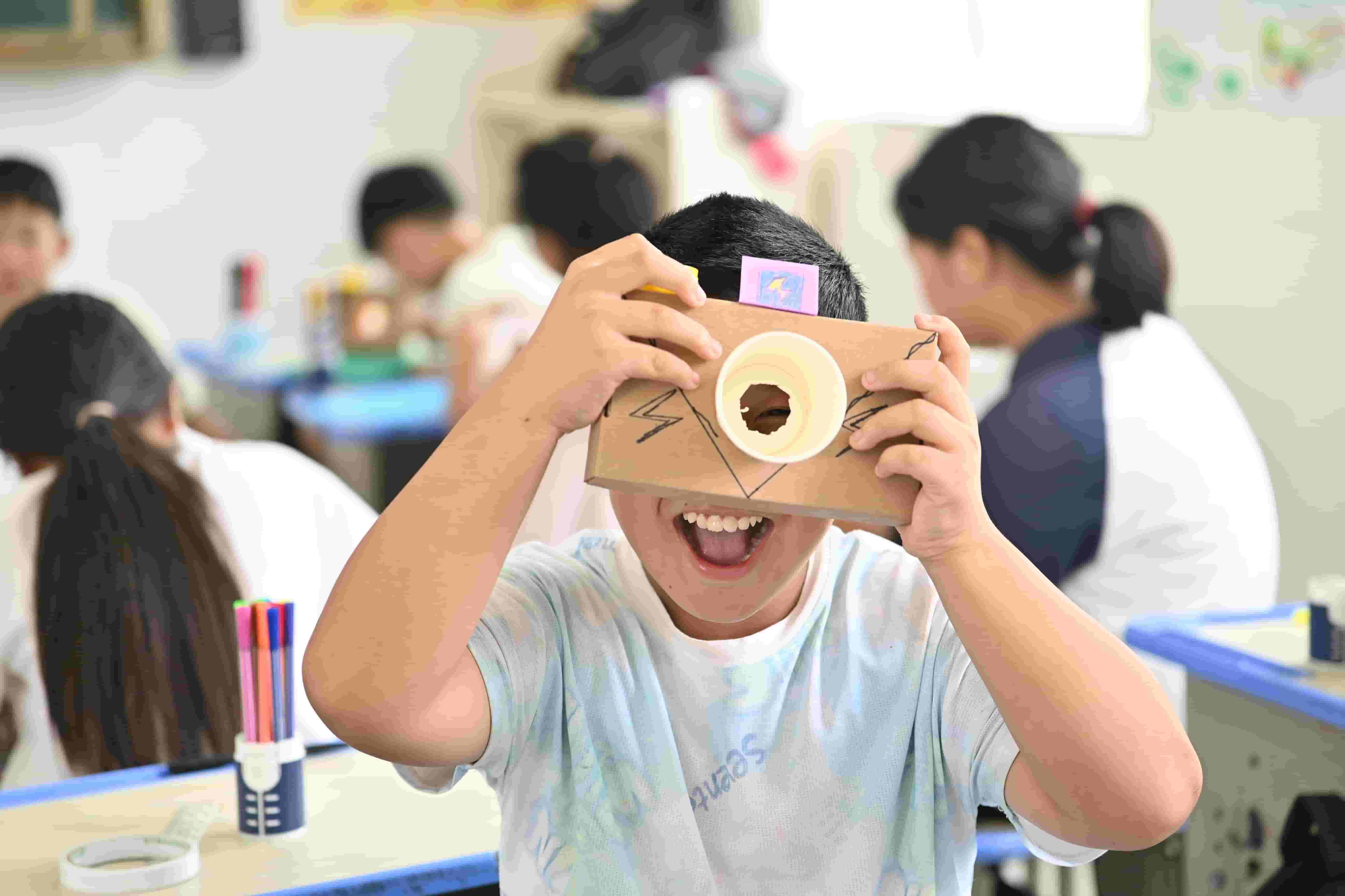當一件件帶著童趣的“紙箱相機”完成時,歪扭的鏡頭、用瓶蓋做成的快門雖不完美,卻承載著孩子們的想象力。孩子們舉著作品四處“拍照”,假裝按下快門的瞬間,教室里的笑聲與陽光交織,定格成最動人的畫面。