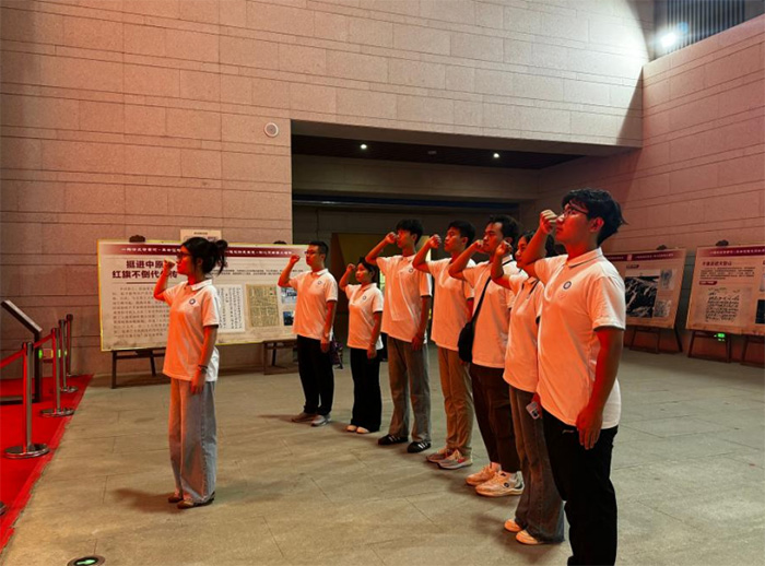 在結束參觀后,服務隊舉行了一場重溫入黨宣誓儀式。全體隊員整齊列隊,面向黨旗,神情肅穆。領誓人聲音洪亮,鏗鏘有力地領讀誓詞,隊員們緊握右拳,莊嚴宣誓。誓言在紀念園上空回蕩,仿佛與先烈們的英魂產生了跨越時空的共鳴,激勵著隊員們不忘初心,牢記使命,在新時代的征程中奮勇前行。