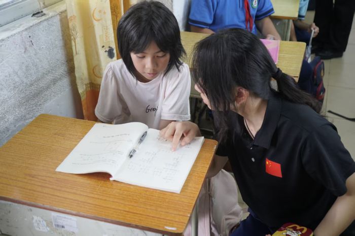 實(shí)踐團(tuán)成員正在為學(xué)生講解數(shù)學(xué)題。黃之恒供圖