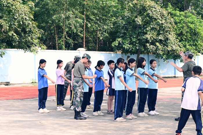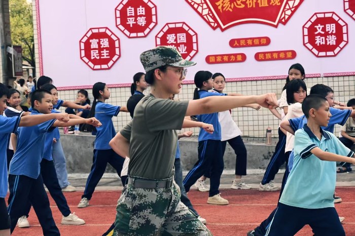操場上,除了國旗護(hù)衛(wèi)隊(duì)的訓(xùn)練,軍體拳教學(xué)也正如火如荼地進(jìn)行。孩子們跟著實(shí)踐團(tuán)成員的口令,有力地出拳、踢腿,一招一式盡顯蓬勃朝氣。“出拳要轉(zhuǎn)腰送力,就像國旗護(hù)衛(wèi)隊(duì)升旗時(shí)的爆發(fā)力”,實(shí)踐團(tuán)成員糾正著動(dòng)作細(xì)節(jié)。這套改編自簡化版軍體拳的課程,已成為孩子們最期待的體育活動(dòng)。