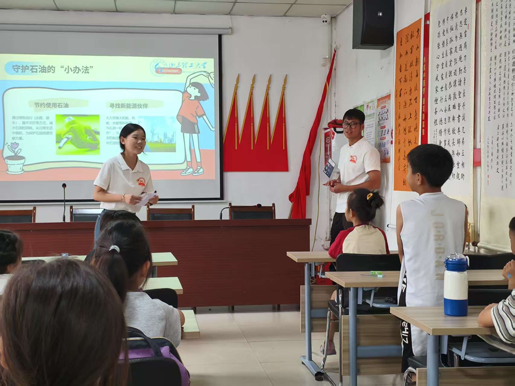 隨后,實踐團成員王彤彤、范子龍共同主講石油知識課程,用通俗的語言拆解專業知識。從石油的形成過程到在生活中的應用最后到當前面臨的資源短缺問題,兩位成員引導孩子認識石油資源的重要性,讓“守護石油”不再是空洞的口號。
