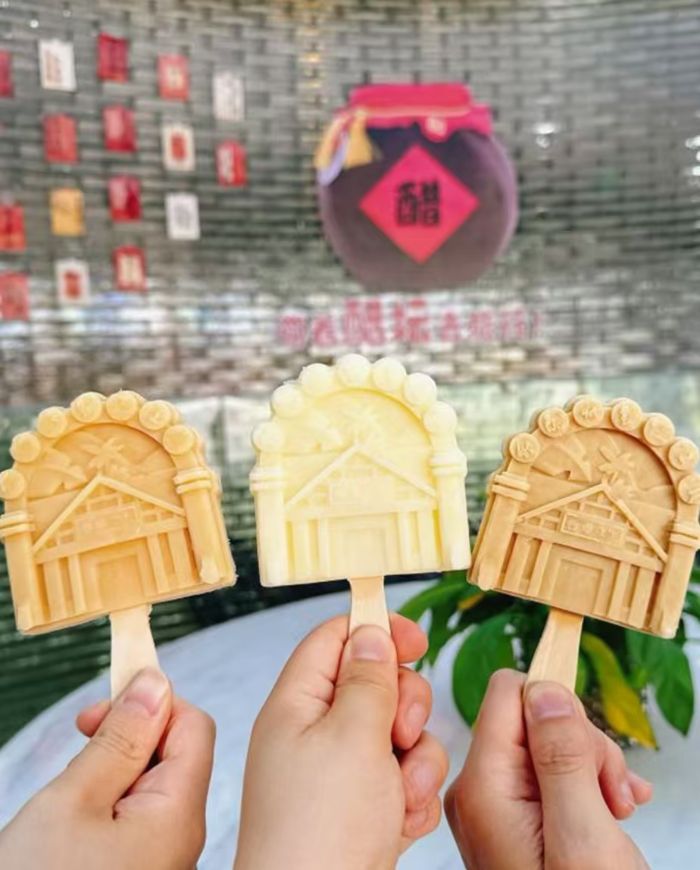 最受關(guān)注的是三款調(diào)味品雪糕:香醋味(添加6%食醋)、黃酒味(7%黃酒)和醬油芝士味(5%釀造醬油)。售價(jià)18元/支的雪糕以博物館拱形廠(chǎng)門(mén)為造型,其中香醋口味呈現(xiàn)出“酸而不澀,甜而不膩”的獨(dú)特風(fēng)味。“第一口有些意外,但越吃越能感受到醋香與奶香的完美平衡。”隊(duì)員們?cè)隗w驗(yàn)后紛紛表示。據(jù)工作人員介紹,這類(lèi)文創(chuàng)產(chǎn)品已成為年輕游客的打卡標(biāo)配,暑期日均銷(xiāo)量達(dá)200余支。