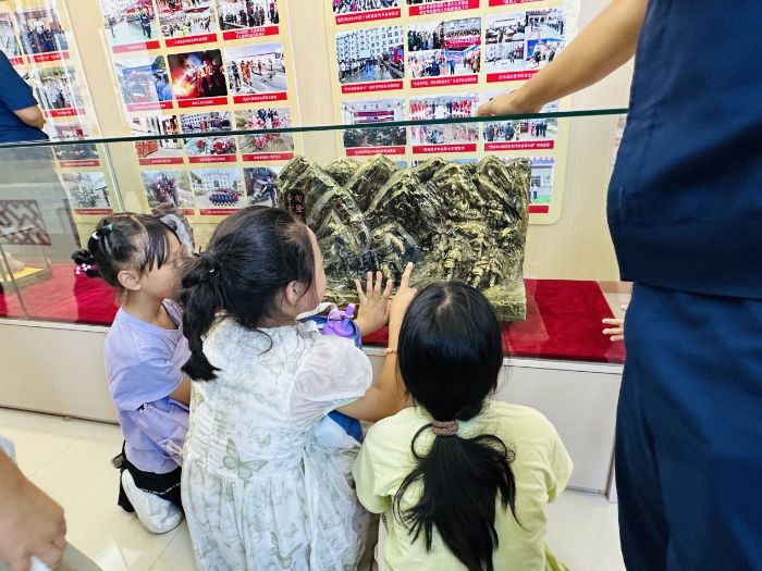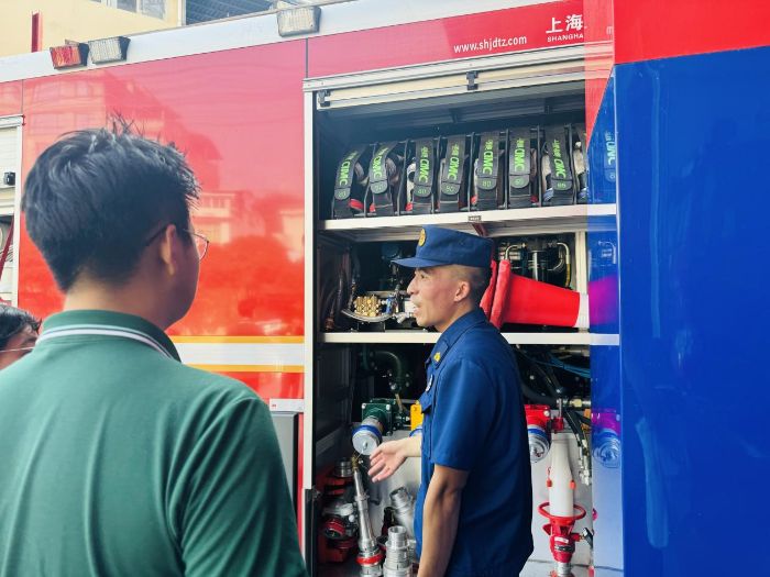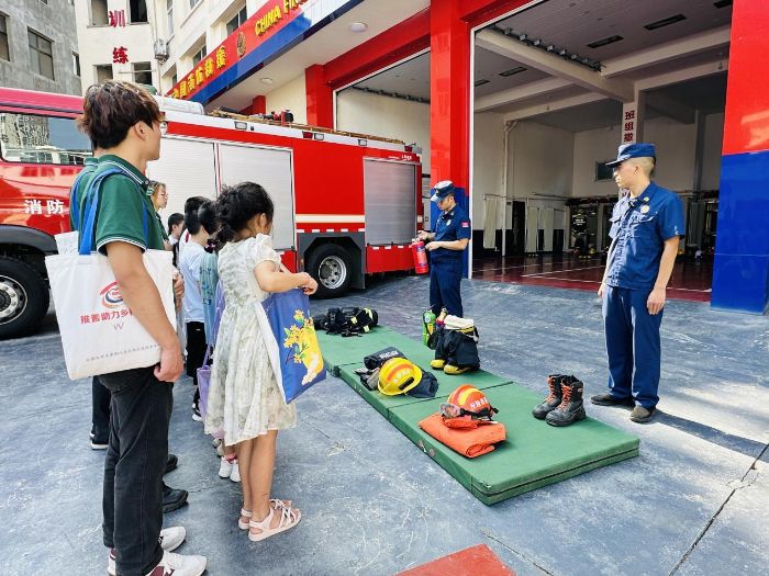 活動伊始,消防大隊的隊長熱情迎接了實踐團成員和孩子們。在隊長的引領下,大家首先來到消防車庫。車庫中整齊停放著各種型號的消防車,它們宛如一個個威風凜凜的“鋼鐵戰士”。隊長用標準的普通話詳細介紹了每輛消防車的名稱、功能、操作方法以及隨車配備的各類消防器材。孩子們滿懷好奇,全神貫注地聆聽講解,還不時用普通話向隊長發問,隊長都耐心地一一解答,現場氣氛十分活躍。