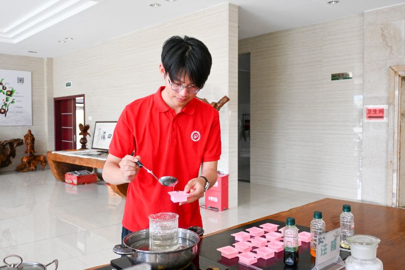 在專業指導下,實踐團成員們親手參與了天然茶油香皂的制作,體驗了傳統智慧與現代工藝的結合。茶油香皂作為茶油相關衍生產品,在市場上取得了不錯的成績,成員們通過親手制作,對產品的深加工有了初步的了解。