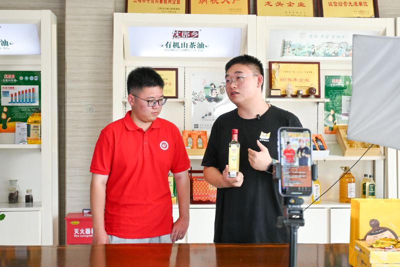 在公司營銷部經理羅武濤的指導下,團隊成員化身“帶貨新人”,學習直播話術與運營技巧,切身感受新業態對農產品“出圈”的強勁推力,并在“沈郎鄉”抖音賬號上實際體驗了一次直播帶貨,與觀眾互動、推廣茶油產品,上了一堂生動的現代營銷實戰課。團隊成員在實踐中體驗了茶油產品從生產端走向消費端的最后一環,也深刻感受到電商直播在拓寬農產品銷售渠道、提升品牌影響力方面的重要作用。