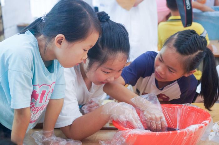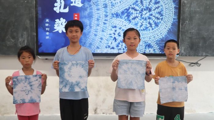 實踐環節,支教組提供標準化材料(純棉白布、藍靛染料、皮筋、塑料盆等),學生按步驟操作:先將棉布充分浸濕,再根據設計需求進行折疊、纏繞、捆扎,隨后浸入染料靜置規定時長,最后拆去捆扎物完成作品。