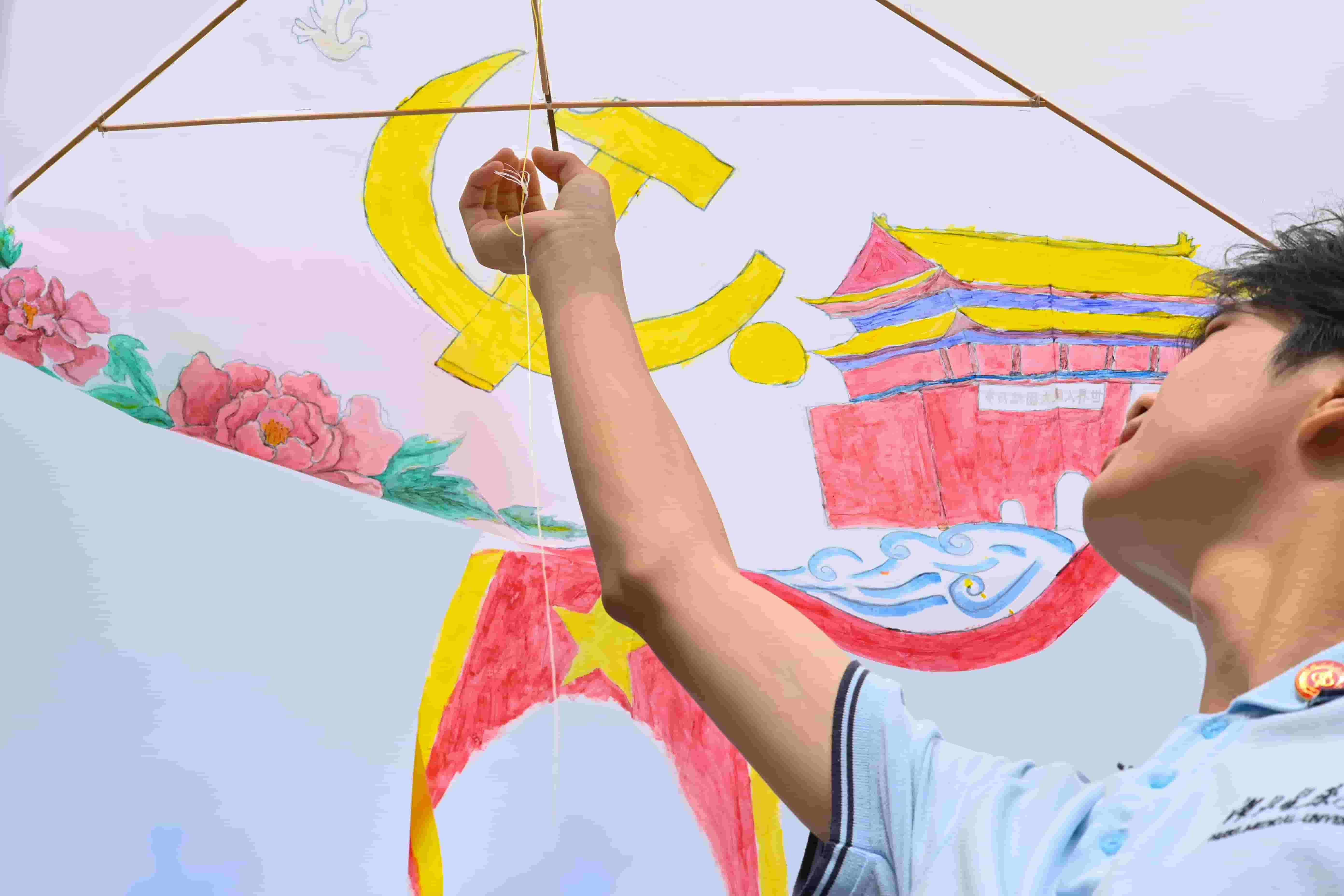 “箏”心筑夢環節里,空白風箏面在孩子們眼中成了施展創意的天地。四個孩子自發圍攏,在隊員羅錦旺、趙政的引導下,用畫筆蘸取五彩顏料,以天馬行空的想象勾勒圖案。沒有刻意安排分工,協作卻自然發生:有人畫翅膀,有人描云朵,有人補色彩,默契在畫筆流轉間悄然滋生。風箏試飛時幾次搖晃下墜,孩子們卻不氣餒,學著調整方向、收放絲線,終于讓彩鳶“咬”住風,舒展翅膀沖上藍天。操場上瞬間爆發出歡呼,孩子們仰著紅撲撲的臉蛋,目光追隨著空中的風箏,陽光灑在他們與風箏上,將協作的智慧、直面挫折的勇氣與夢想成真的喜悅,一同送向晴空。