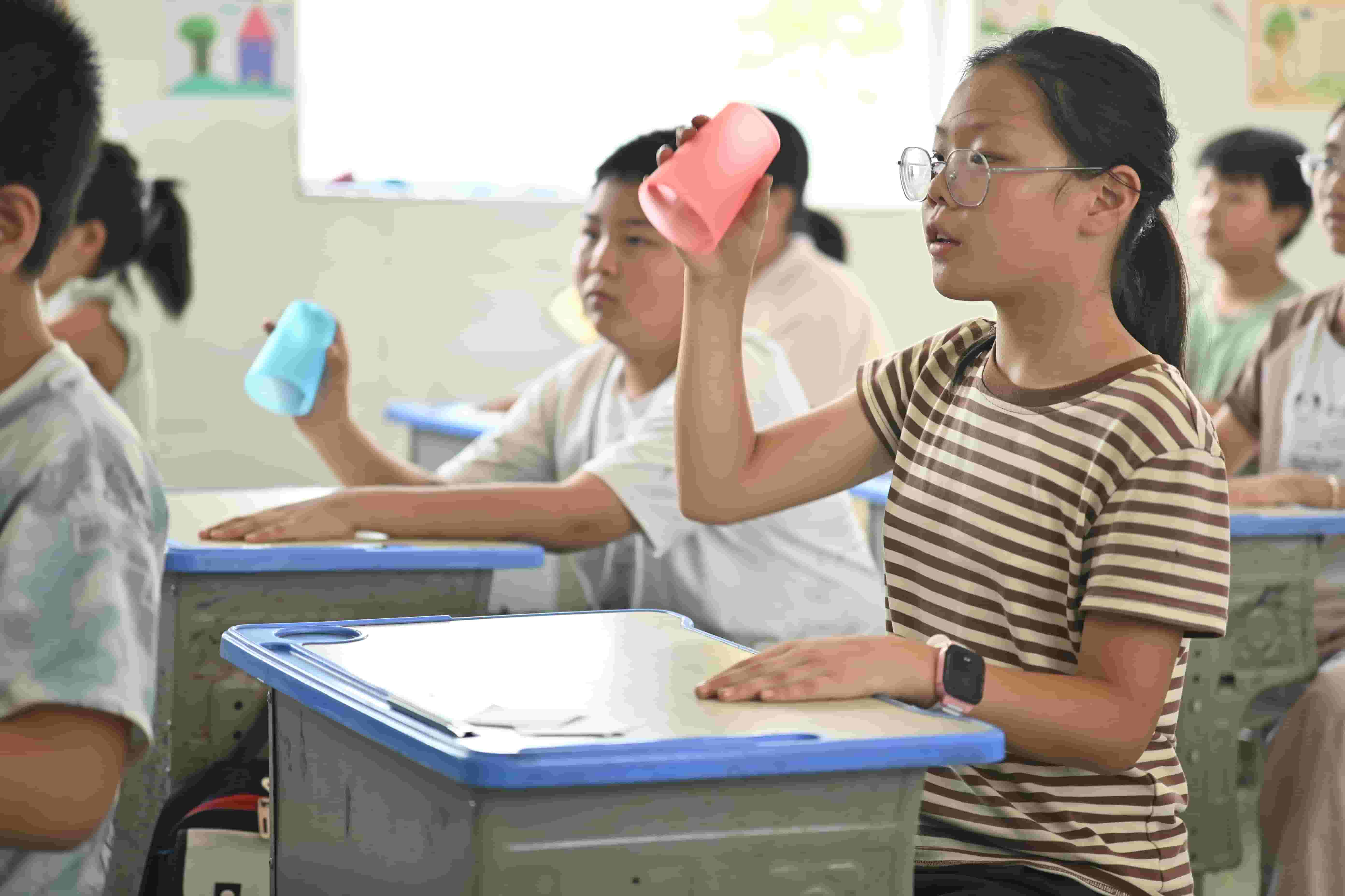 音樂課上,普通的塑料杯變成了“魔法樂器”。在隊員張詩涵的帶領下,孩子們跟著節奏練習敲擊、翻轉、鼓掌。起初教室里“乒乒乓乓”一片雜亂,杯子還總調皮“逃跑”,但孩子們緊盯老師手勢,反復磨合。很快,“噠——噠噠——啪!”的節奏從零散變得統一,塑料杯在桌面與掌心間跳躍旋轉,碰撞出清脆韻律,整個教室沉浸在節奏狂歡中,笑聲與節拍交織成最動人的樂章。