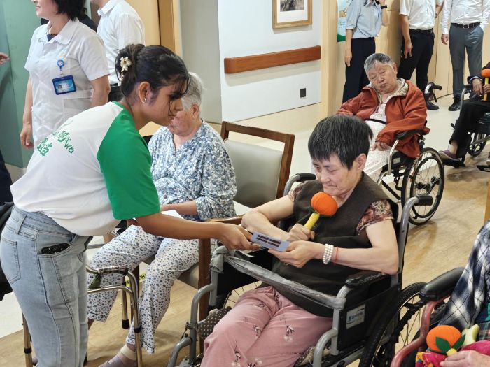 緊接著,留學(xué)生成員們帶領(lǐng)老人們做起了簡(jiǎn)單易學(xué)的手指操。伸展、彎曲、對(duì)指……這些基礎(chǔ)動(dòng)作在老人們的認(rèn)真練習(xí)下顯得格外投入。學(xué)子們?cè)谝慌韵ば氖痉吨笇?dǎo),活動(dòng)現(xiàn)場(chǎng)歡聲笑語不斷,掌心相觸間傳遞著跨越國(guó)界的融融暖意。