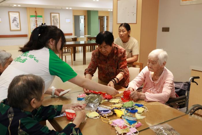 最受期待的“巾藥福袋”制作環(huán)節(jié)將氣氛推向高潮。學(xué)子們提前備好了艾草、薄荷等具有安神、驅(qū)蚊功效的中草藥,以及精美的棉布和彩繩。他們先向老人們介紹每種藥材的作用,隨后一同小心翼翼地將藥材裝入布袋,再用彩繩系出漂亮的結(jié)。百歲老人郭奶奶在學(xué)子們的幫助下也順利完成了香囊制作。蒼老的指尖與年輕的手掌相觸,仿佛完成了一場(chǎng)跨越時(shí)光的溫暖接力。老人們捧著自己親手制作的福袋,臉上洋溢著幸福的笑容。這小小的福袋,承載的不僅是健康的祈愿,更是濃濃的溫情。